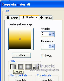 qui puoi trovare qualche risposta ai tuoi dubbi. Se l'argomento che ti interessa non è presente, ti prego di segnalarmelo. Questo tutorial è stato scritto con CorelX6 e tradotto con CorelX e CorelX2, ma può essere realizzato anche con le altre versioni di PSP. Dalla versione X4, il comando Immagine>Rifletti è stato sostituito con Immagine>Capovolgi in orizzontale, e il comando Immagine>Capovolgi con Immagine>Capovolgi in verticale. Nelle versioni X5 e X6, le funzioni sono state migliorate rendendo disponibile il menu Oggetti. Con la nuova versione X7, sono tornati Rifletti>Capovolgi, ma con nuove varianti. Vedi la scheda sull'argomento qui traduzione in francese/traduction en français qui/ici Versioni/Versions quiOccorrente: Materiale qui (in questa pagina trovi i links ai siti dei creatori di tubes) Filtri: se hai problemi con i filtri, consulta la mia sezione filtri qui Filters Unlimited 2.0 qui Mehdi - Sorting Tiles qui Toadies - What are you qui Texture - Texturizer qui Alien Skin Eye Candy 5 Impact - Perspective Shadow qui AAA Filters - Custom qui I filtri Toadies si possono usare da soli o importati in Filters Unlimited (come fare vedi qui) Se un filtro fornito appare con questa icona ![]() non esitare a cambiare modalità di miscelatura e opacità secondo i colori utilizzati. Metti i preset Cliccando sul file una o due volte (a seconda delle tue impostazioni), automaticamente il preset si installerà nella cartella corretta. perchè uno o due clic vedi qui ![]() Metti il gradiente nella cartella Gradienti. Metti le selezioni nella cartella Selezioni. Apri la maschera in PSP e minimizzala con il resto del materiale. 1. Imposta il colore di primo piano con #fcdf3f, e il colore di sfondo con il colore #202020. ![]() Passa il colore di primo piano a Gradiente e seleziona il gradiente huetint-yelloworange, stile Lineare ![]() 2. Apri una nuova immagine trasparente 900 x 500 pixels, e riempila con il gradiente.3. Regola>Sfocatura>Sfocatura radiale. ![]() 4. Effetti>Plugins>Mehdi - Sorting Tiles. ![]() 5. Effetti>Plugins>Toadies - What are you. ![]() Effetti>Effetti di bordo>Aumenta. 6. Livelli>Duplica. Effetti>Effetti di distorsione>Onda. ![]() Cambia la modalità di miscelatura di questo livello in Sovrapponi. ![]() 7. Effetti>Plugins>Texture - Texturizer ![]() Regola>Messa a fuoco>Metti a fuoco. 8. Open GraphiCeylanselect e vai a Modifica>Copia. Torna al tuo lavoro e vai a Modifica>Incolla come nuovo livello. Cambia la modalità di miscelatura di questo livello in Sovrapponi. 9. Apri il tube Graphiceylan1 e vai a Modifica>Copia. Torna al tuo lavoro e vai a Modifica>Incolla come nuovo livello. Cambia la modalità di miscelatura di questo livello in Filtra. ![]() 10. Selezione>Carica/Salva selezione>Carica selezione da disco. Cerca e carica la selezione 2ceylanSelections. ![]() Premi sulla tastiera il tasto CANC ![]() ![]() Selezione>Deseleziona. 11. Apri Deco-Saat e vai a Modifica>Copia. Torna al tuo lavoro e vai a Modifica>Incolla come nuovo livello. Cambia la modalità di miscelatura di questo livello in Sovrapponi. Effetti>Effetti di immagine>Scostamento. ![]() 12. Selezione>Carica/Salva selezione>Carica selezione da disco. Carica nuovamente la selezione 2ceylanSelections. ![]() Premi sulla tastiera il tasto CANC ![]() Selezione>Deseleziona. 13. Livelli>Nuovo livello raster. Selezione>Carica/Salva selezione>Carica selezione da disco. Cerca e carica la selezione 1ceylanSelections. ![]() 14. Apri compass-1 e vai a Modifica>Copia. Torna al tuo lavoro e vai a Modifica>Incolla nella selezione. Regola>Messa a fuoco>Metti a fuoco. Selezione>Deseleziona. Cambia la modalità di miscelatura di questo livello in Luce netta. ![]() 15. Livelli>Nuovo livello raster. Selezione>Carica/Salva selezione>Carica selezione da disco. Cerca e carica nuovamente la selezione 2ceylanSelections. ![]() 16. Apri nuovamente GraphiCeylanselect e vai a Modifica>Copia. Torna al tuo lavoro e vai a Modifica>Incolla nella selezione. Regola>Messa a fuoco>Metti a fuoco. Cambia la modalità di miscelatura di questo livello in Sovrapponi. Selezione>Deseleziona. ![]() 17. Imposta il colore di primo piano con il colore bianco #ffffff. Livelli>Nuovo livello raster. Riempi il livello con il colore bianco #ffffff.Livelli>Nuovo livello maschera>Da immagine. Apri il menu sotto la finestra di origine e vedrai la lista dei files aperti. Seleziona la maschera Narah_mask_0788. ![]() Livelli>Unisci>Unisci gruppo. Cambia la modalità di miscelatura di questo livello in Sovrapponi. 18. Livelli>Nuovo livello raster. Selezione>Carica/Salva selezione>Carica selezione da disco. Cerca e carica la selezione 3ceylanSelections. ![]() Riempi la selezione con il colore bianco.Selezione>Deseleziona. Effetti>Effetti 3D>Sfalsa ombra, colore #000000. ![]() 19. Effetti>Plugins>Alien Skin Eye Candy 5 Impact - Perspective Shadow. Seleziona il preset ceylan e ok. ![]() 20. Apri il tube Deco-Graphiceylan2 e vai a Modifica>Copia. Torna al tuo lavoro e vai a Modifica>Incolla come nuovo livello. Effetti>Effetti di immagine>Scostamento. ![]() 21. Apri il tube della coppia couple-6171373_1920 e vai a Modifica>Copia. Torna al tuo lavoro e vai a Modifica>Incolla come nuovo livello. Effetti>Effetti di immagine>Scostamento. ![]() 22. Effetti>Plugins>Alien Skin Eye Candy 5 Impact - Perspective Shadow. Seleziona il preset ceylan1 e ok. ![]() Effetti>Effetti 3D>Sfalsa ombra, colore #000000. ![]() 23. Livelli>Unisci>Unisci tutto. 24. Selezione>Seleziona tutto. Immagine>Aggiungi bordatura, simmetriche non selezionato - colore bianco #ffffff. ![]() Selezione>Inverti. Riporta il colore di primo piano al gradiente iniziale ![]() Riempi la selezione con il gradiente.25. Regola>Aggiungi/Rimuovi disturbo>Aggiungi disturbo. ![]() Regola>Messa a fuoco>Metti a fuoco. Selezione>Deseleziona. 26. Immagine>Ridimensiona, 950 pixels di larghezza, tutti i livelli selezionato. 27. Apri il tube Tekst1 e vai a Modifica>Copia. Torna al tuo lavoro e vai a Modifica>Incolla come nuovo l