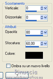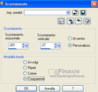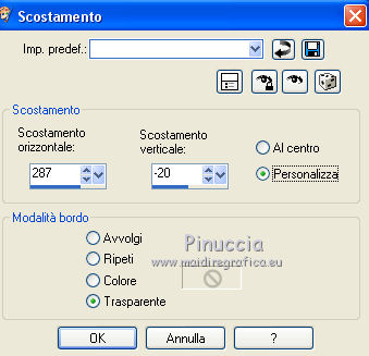 qui puoi trovare qualche risposta ai tuoi dubbi. Se l'argomento che ti interessa non è presente, ti prego di segnalarmelo. Questo tutorial è stato scritto con CorelX6 e tradotto con Corel X e CorelX2, ma può essere realizzato anche con le altre versioni di PSP. Dalla versione X4, il comando Immagine>Rifletti è stato sostituito con Immagine>Capovolgi in orizzontale, e il comando Immagine>Capovolgi con Immagine>Capovolgi in verticale. Nelle versioni X5 e X6, le funzioni sono state migliorate rendendo disponibile il menu Oggetti. Con la nuova versione X7, sono tornati Rifletti>Capovolgi, ma con nuove varianti. Vedi la scheda sull'argomento qui traduzione in francese/traduction en français qui/iciVersioni/Versions qui Occorrente: Materiale qui Grazie: per i tubes Animabelle e Sonia. (in questa pagina trovi i links ai siti dei creatori di tubes) Filtri: se hai problemi con i filtri, consulta la mia sezione filtri qui Filters Unlimited 2.0 qui Sybia - Spyrozag qui AAA Filters - Custom qui I filtri Sybia si possono usare da soli o importati in Filters Unlimited (come fare vedi qui) Se un filtro fornito appare con questa icona ![]() non esitare a cambiare modalità di miscelatura e opacità secondo i colori utilizzati. Metti i pennelli nella cartella Pennelli. Attenzione, ogni pennello è composto da 2 files che non devono essere separati. Vedi gli appunti sui pennelli qui Imposta il colore di primo piano con #202020, e il colore di sfondo con #b75927. ![]() 1. Apri una nuova immagine trasparente 900 x 600 pixels. 2. Selezione>Seleziona tutto. Apri Lilith(4).jpg e vai a Modifica>Copia. Torna al tuo lavoro e vai a Modifica>Incolla nella selezione. Selezione>Deseleziona. 3. Effetti>Plugins>Filters Unlimited 2.0 - Sybia - Spyrozag ![]() 4. Livelli>Nuovo livello raster. Selezione>Seleziona tutto. 5. Apri Decoceylan psp, e vai a Modifica>Copia. Torna al tuo lavoro e vai a Modifica>Incolla nella selezione. Selezione>Deseleziona. 6. Abbassa l'opacità di questo livello al 71%. 7. Apri il tube Soniatubes_7933 e vai a Modifica>Copia. Torna al tuo lavoro e vai a Modifica>Incolla come nuovo livello. 8. Effetti>Effetti di immagine>Scostamento. ![]() 9. Apri il tube mist_exclusif_paysage_animabelle e vai a Modifica>Copia. Torna al tuo lavoro e vai a Modifica>Incolla come nuovo livello. 10. Effetti>Effetti di immagine>Scostamento. ![]() 11. Livelli>Unisci>Unisci tutto. 12. Immagine>Aggiungi bordatura, 1 pixel, simmetriche, colore di primo piano #202020. Immagine>Aggiungi bordatura, 40 pixels, simmetriche, colore di sfondo #b75927. 13. Immagine>Ridimensiona, 900 pixels di larghezza, tutti i livelli selezionato. 14. Attiva lo strumento Bacchetta magica ![]() e clicca nel bordo di 40 pixels per selezionarlo. 15. Livelli>Nuovo livello raster. Apri Lilith (9)jpg, e vai a Modifica>Copia. Torna al tuo lavoro e vai a Modifica>Incolla nella selezione. Selezione>Deseleziona. 16. Effetti>Plugins>Filters Unlimited 2.0 - Buttons &Frames - 3D Glass Frame. ![]() 17. Effetti>Effetti 3D>Sfalsa ombra, colore nero. ![]() 18. Livelli>Unisci>Unisci giù. 19. Effetti>Plugins>AAA Filters - Custom, clicca su Landscape e ok. ![]() 20. Apri Decoceylan1psp e vai a Modifica>Copia. Torna al tuo lavoro e vai a Modifica>Incolla come nuovo livello. 21. Effetti>Effetti di immagine>Scostamento. ![]() 22. Apri Texsceylan, e vai a Modifica>Copia. Torna al tuo lavoro e vai a Modifica>Incolla come nuovo livello. Spostalo in basso a sinistra.![]() 23. Livelli>Nuovo livello raster. Attiva lo strumento Pennello ![]() cerca e seleziona il pennello 3Brush ![]() Imposta il colore di sfondo con il colore bianco Applica il pennello accanto al testo, cliccando con il tasto destro del mouse, per usare il colore bianco di sfondo. ![]() 24. Livelli>Nuovo livello raster. Strumento Pennello ![]() cerca e seleziona il pennello 2Brush ![]() e applicalo in alto cliccando con il tasto sinistro del mouse, per usare il colore di primo piano. ![]() 25. Firma il tuo lavoro su un nuovo livello. Livelli>Unisci>Unisci tutto e salva in formato jpg. ![]() Puoi scrivermi se hai problemi o dubbi, o trovi un link che non funziona, o soltanto per un saluto. 24 Giugno 2018 |
