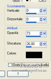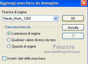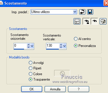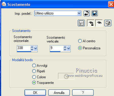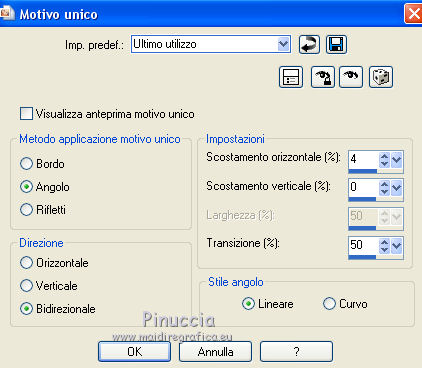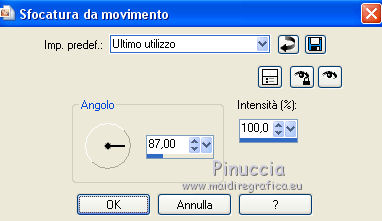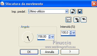 qui puoi trovare qualche risposta ai tuoi dubbi. Se l'argomento che ti interessa non è presente, ti prego di segnalarmelo. Questo tutorial è stato tradotto con Corel X e CorelX2, ma può essere realizzato anche con le altre versioni di PSP. Dalla versione X4, il comando Immagine>Rifletti è stato sostituito con Immagine>Capovolgi in orizzontale, e il comando Immagine>Capovolgi con Immagine>Capovolgi in verticale. Nelle versioni X5 e X6, le funzioni sono state migliorate rendendo disponibile il menu Oggetti. Con la nuova versione X7, sono tornati Rifletti>Capovolgi, ma con nuove varianti. Vedi la scheda sull'argomento qui traduzione in francese/traduction en français qui/iciVersioni/Versions qui Occorrente: Materiale qui Grazie: per i tubes Criss, Drevers et Marif; per le maschere Narah. (in questa pagina trovi i links ai siti dei creatori di tubes) Filtri: se hai problemi con i filtri, consulta la mia sezione filtri qui Flaming Pear - Flood qui AAA Filters - Custom qui Alien Skin Eye Candy 5 Impact - Glass qui ![]() non esitare a cambiare modalità di miscelatura e opacità secondo i colori utilizzati. Metti la selezione nella cartella Selezioni. Apri le maschere in PSP e minimizzale con il resto del material. Imposta il colore di primo piano con il colore bianco, e il colore di sfondo con un colore scuro del tuo tube. 1. Apri una nuova immagine trasparente 850 x 550 pixels. 2. Selezione>Seleziona tutto. Apri l'immagine in jpg 4530d0a29f7901adc9976072e48956ec e vai a Modifica>Copia. Torna al tuo lavoro e vai a Modifica>Incolla nella selezione. Selezione>Deseleziona. 3. Effetti>Effetti di immagine>Motivo unico. ![]() 4. Regola>Sfocatura>Sfocatura da movimento. ![]() 5. Ripeti Regola>Sfocatura>Sfocatura da movimento, con i seguenti settaggi ![]() 6. Regola>Messa a fuoco>Metti a fuoco - 2 volte. 7. Apri il tube del paesaggio "manzara" (Drevers_misted_lanscape) e vai a Modifica>Copia. Torna al tuo lavoro e vai a Modifica>Incolla come nuovo livello. 8. Apri il tube del paesaggio Marif_2007_09Septembre_arbre02 e vai a Modifica>Copia. Torna al tuo lavoro e vai a Modifica>Incolla come nuovo livello. Immagine>Ridimensiona, al 77%, tutti i livelli non selezionato. 9. Effetti>Effetti di immagine>Scostamento. ![]() 10. Effetti>Plugins>Flaming Pear - Flood - colore #24c5db ![]() 11. Livelli>Nuovo livello raster. Riempi il livello con il colore scuro.Cambia la modalità di miscelatura di questo livello in Dissolvi e abbassa l'opacità al 2%. 12. Livelli>Nuovo livello raster. Riempi con il colore bianco #ffffff.13. Livelli>Nuovo livello maschera>Da immagine. Apri il menu sotto la finestra di origine e vedrai la lista dei files aperti. Seleziona la maschera Narah_Mask_1045. ![]() Livelli>Duplica. Livelli>Unisci>Unisci gruppo. 14. Livelli>Nuovo livello raster. Riempi con il colore bianco #ffffff.15. Livelli>Nuovo livello maschera>Da immagine. Apri il menu sotto la finestra di origine e seleziona la maschera Narah_Mask_1264. ![]() Livelli>Duplica. Livelli>Unisci>Unisci gruppo. 16. Livelli>Duplica. Immagine>Rifletti. Abbassa l'opacità di questo livello al 48%. 17. Livelli>Unisci>Unisci tutto. 18. Immagine>Aggiungi bordatura, simmetriche non selezionato, colore bianco #fffff. ![]() 19. Immagine>Aggiungi bordatura, 30 pixels, simmetriche, colore #202020. 20. Immagine>Ridimensiona, 900 pixels di larghezza, tutti i livelli selezionato. 21. Effetti>Plugins>AAA Filters - Custom - clicca su Landscape e ok. ![]() 22. Apri il tube Criss 2751 e vai a Modifica>Copia. Torna al tuo lavoro e vai a Modifica>Incolla come nuovo livello. Immagine>Ridimensiona, 2 volte all'80%, tutti i livelli non selezionato. Sposta il tube a sinistra.Effetti>Effetti 3D>Sfalsa ombra, a scelta. 23. Apri il tube Deco1 e vai a Modifica>Copia. Torna al tuo lavoro e vai a Modifica>Incolla come nuovo livello. 24. Effetti>Effetti di immagine>Scostamento. ![]() 25. Apri il tube TextCeylan e vai a Modifica>Copia. Torna al tuo lavoro e vai a Modifica>Incolla come nuovo livello. 26. Effetti>Effetti di immagine>Scostamento. ![]() 27. Selezione>Carica/Salva selezione>Carica selezione da disco. Cerca e carica la selezione selectionceylan7. ![]() 28. Livelli>Nuovo livello raster. Riempi con il colore bianco #ffffff.29. Selezione>Modifica>Contrai - 10 pixels. ![]() Riempi con il colore scuro.30. Effetti>Plugins>Alien Skin Eye Candy 5 Impact - Glass. ![]() Selezione>Deseleziona. 31. Effetti>Effetti 3D>Sfalsa ombra. ![]() 32. Apri Decoceylan2 e vai a Modifica>Copia. Torna al tuo lavoro e vai a Modifica>Incolla come nuovo livello. 33. Effetti>Effetti di immagine>Scostamento. ![]() 34. Regola>Tonalità e saturazione>Viraggio. ![]() 35. Effetti>Effetti 3D>Sfalsa ombra. ![]() 36. Firma il tuo lavoro e salva in formato jpg. Il tube di questo esempio è di Alies ![]() ![]() Puoi scrivermi se hai problemi o dubbi, o trovi un link che non funziona, o soltanto per un saluto. 21 Giugno 2018 |