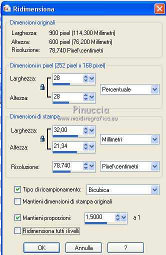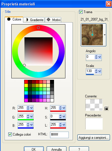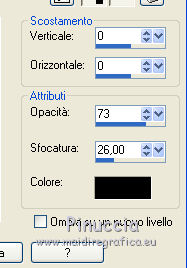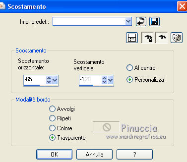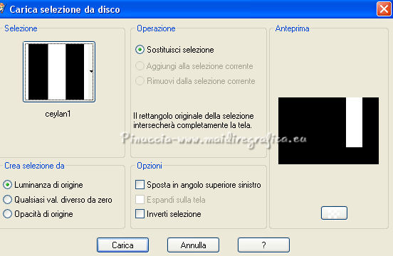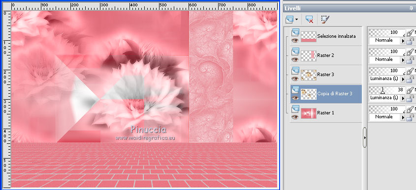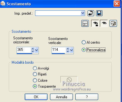 qui puoi trovare qualche risposta ai tuoi dubbi. Se l'argomento che ti interessa non è presente, ti prego di segnalarmelo. Questo tutorial è stato tradotto con Corel X e CorelX17, ma può essere realizzato anche con le altre versioni di PSP. Dalla versione X4, il comando Immagine>Rifletti è stato sostituito con Immagine>Capovolgi in orizzontale, e il comando Immagine>Capovolgi con Immagine>Capovolgi in verticale. Nelle versioni X5 e X6, le funzioni sono state migliorate rendendo disponibile il menu Oggetti. Con la nuova versione X7, sono tornati Rifletti>Capovolgi, ma con nuove varianti. Vedi la scheda sull'argomento qui traduzione in francese/traduction en français qui/iciVersioni/Versions qui Occorrente: Materiale qui Per il tube della donna grazie Animabelle Filtri: se hai problemi con i filtri, consulta la mia sezione filtri qui Filters Unlimited 2.0 qui Mehdi - Wavy Lab 1.1 qui Mehdi - Sorting Tiles qui Simple - Pizza Slice Mirror qui Alien Skin Eye Candy 5 Impact - Textures qui Mura's Meister - Perspective Tiling qui AAA Filters - AAA Framer qui I filtri Simple si possono usare da soli o importati in Filters Unlimited (come fare vedi qui) Se un filtro fornito appare con questa icona ![]() non esitare a cambiare modalità di miscelatura e opacità secondo i colori utilizzati. Metti le selezioni nella cartella Selezioni. 1. Imposta il colore di primo piano con #e37380, e il colore di sfondo con il colore bianco #ffffff. ![]() 2. Apri una nuova immagine trasparente 900 x 600 pixels. Effetti>Plugins>Mehdi - Wavy Lab 1.1 Questo filtro crea gradienti con i colori della paletta, cambia il primo colore con lo stesso colore di primo piano #e37380, e il terzo colore con il colore bianco #ffffff. ![]() 3. Effetti>Plugins>Mehdi - Sorting Tiles. ![]() 4. Effetti>Effetti di bordo>Aumenta. 5. Ripeti Effetti>Plugins>Mehdi - Sorting Tiles, questa volta Mosaic selezionato. ![]() 6. Effetti>Plugins>Simple - Pizza Slice Mirror. Regola>Messa a fuoco>Metti a fuoco. 7. Selezione>Carica/Salva selezione>Carica selezione da disco. Cerca e carica la selezione Ceylan ![]() Selezione>Innalza selezione a livello. 8. Effetti>Plugins>Alien Skin Eye Candy 5 Textures - Brick Wall Brick color: colore di primo piano; Mortar Color: #c0c0c0 ![]() 9. Effetti>Plugins>Mura's Meister - Perspective Tiling. ![]() Regola>Messa a fuoco>Metti a fuoco. Selezione>Deseleziona. 10. Livelli>Nuovo livello raster. Livelli>Disponi>Sposta giù. 11. Selezione>Carica/Salva selezione>Carica selezione da disco. Cerca e carica la selezione Ceylan 1. ![]() Riempi con il colore di primo piano #e37380.Apri la paletta del colore di sfondo, seleziona Trama e scegli una trama a tuo piacimento (se vuoi usare la mia trama, la trovi nel materiale) ![]() Livelli>Nuovo livello raster. Riempi la selezione con questo colore tramato.13. Livelli>Unisci>Unisci giù. Selezione>Deseleziona. 14. Apri il tube cicek e vai a Modifica>Copia. Torna al tuo lavoro e vai a Modifica>Incolla come nuovo livello. Livelli>Disponi>Sposta giù. Regola>Messa a fuoco>Metti a fuoco. Cambia la modalità di miscelatura di questo livello in Luminanza (esistente). 15. Effetti>Effetti di immagine>Motivo unico. ![]() 16. Livelli>Duplica. Effetti>Effetti di immagine>Scostamento. ![]() Effetti>Effetti di bordo>Aumenta. Livelli>Disponi>Sposta giù. Abbassa l'opacità di questo livello al 38%. ![]() 17. Apri il tube Ceylan Deco e vai a Modifica>Copia. Torna al tuo lavoro e vai a Modifica>Incolla come nuovo livello. 18. Effetti>Effetti di immagine>Scostamento. ![]() 19. Apri il tube Deco 1 e vai a Modifica>Copia. Torna al tuo lavoro e vai a Modifica>Incolla come nuovo livello. 20. Effetti>Effetti di immagine>Scostamento. ![]() Regola>Messa a fuoco>Metti a fuoco. 21. Apri il tube Femme_Page6_Animabelle e vai a Modifica>Copia. Torna al tuo lavoro e vai a Modifica>Incolla come nuovo livello. Immagine>Ridimensiona, al 69%, tutti i livelli non selezionato. ![]() 22. Effetti>Effetti di immagine>Scostamento. ![]() 23. Effetti>Effetti 3D>Sfalsa ombra. ![]() 24. Apri il tube dei fiori PSBT-May18-FlowerPower-DBMagnolia 6 e vai a Modifica>Copia. Torna al tuo lavoro e vai a Modifica>Incolla come nuovo livello. Immagine>Ridimensiona, al 28%, tutti i livelli non selezionato. ![]() 25. Effetti>Effetti di immagine>Scostamento. ![]() 26. Effetti>Effetti 3D>Sfalsa ombra, con i settaggi precedenti. ![]() 27. Livelli>Duplica. Immagine>Ridimensiona, al 65%, tutti i livelli non selezionato. 28. Effetti>Effetti di immagine>Scostamento. ![]() 29. Immagine>Aggiungi bordatura, 2 pixels, simmetriche, colore #ffffff. Immagine>Aggiungi bordatura, 3 pixels, simmetriche, colore #202020. Immagine>Aggiungi bordatura, 40 pixels, simmetriche, colore #ffffff. 30. Effetti>Plugins>AAA Filters - AAA FRAMER. ![]() 31. Immagine>Ridimensiona, 900 pixels di larghezza, tutti i livelli selezionato. 32. Apri il tube Text-Ceylan e vai a Modifica>Copia. Torna al tuo lavoro e vai a Modifica>Incolla come nuovo livello. Spostalo in alto a sinistra.33. Firma il tuo lavoro e salva in formato jpg. Esempio con tube di Malacka ![]() ![]() Puoi scrivermi se hai problemi o dubbi, o trovi un link che non funziona, o soltanto per un saluto. 25 Maggio 2018 |
