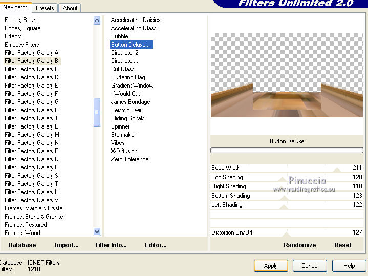 7. Effetti>Plugins>Filters Unlimited 2.0 - Filter Factory Gallery B - Button DeLuxe, con i settaggi standard.