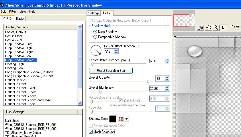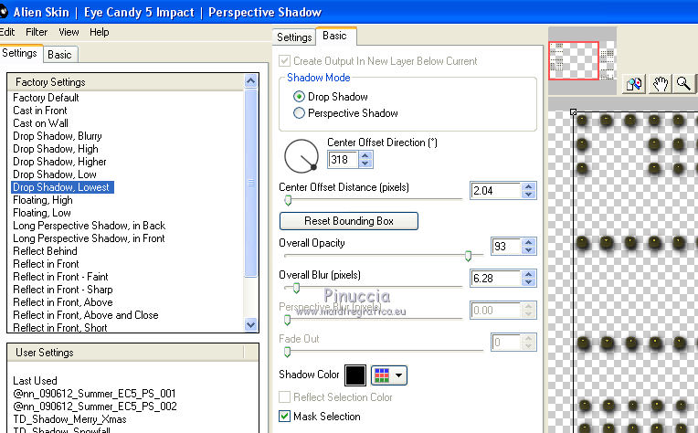 Seleziona il preset Drop Shadow Lowest con i seguenti settaggi
