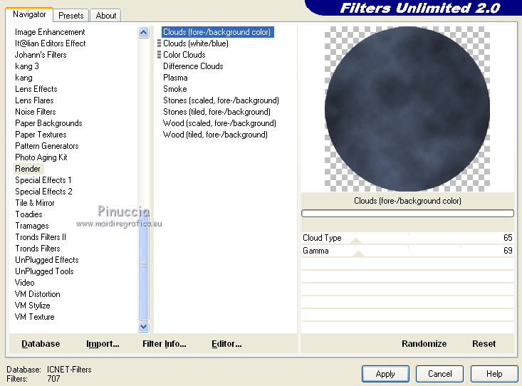 Effetti>Plugins>Filters Unlimited - Render - Clouds/fore-/background color):