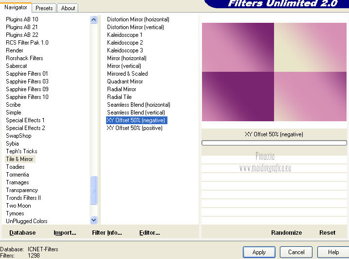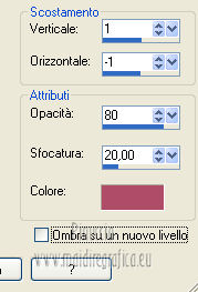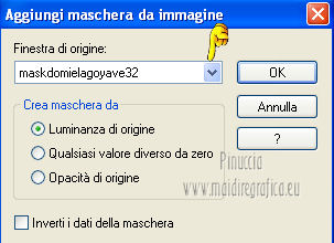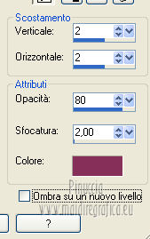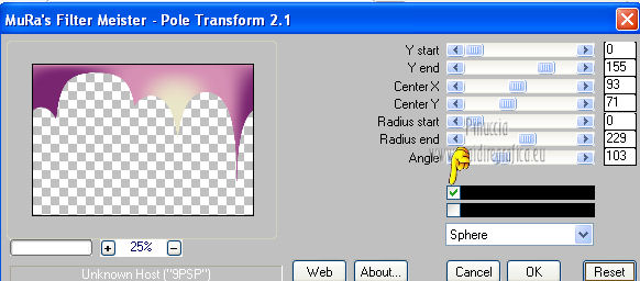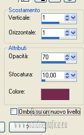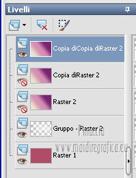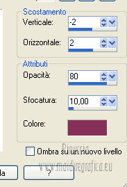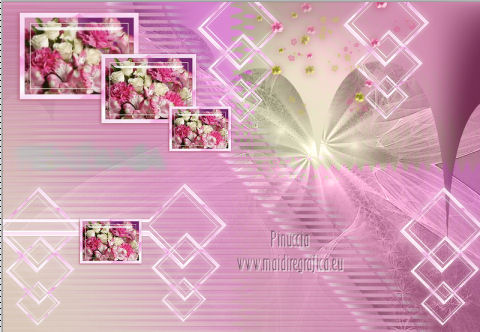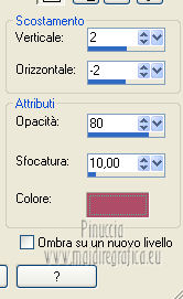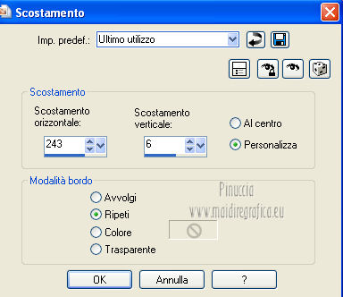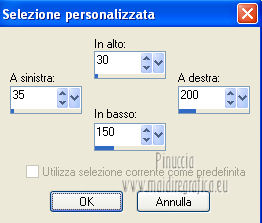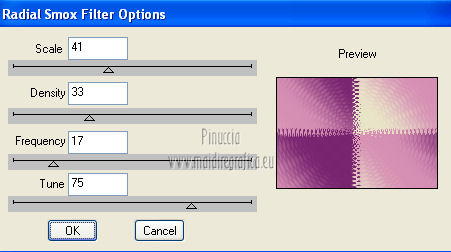 qui puoi trovare qualche risposta ai tuoi dubbi. Se l'argomento che ti interessa non è presente, ti prego di segnalarmelo. Questo tutorial è stato creato con la versione X4, ma può essere eseguito anche con le altre versioni di PSP. Per tradurlo ho usato Corel X. Occorrente: Materiale qui Il tube della donna è di Chris. La maschera è di Domie la Goyave. Filtri: Filters Unlimited 2.0 qui DSB Flux - Linear Transmission, Radial Smox qui Penta.com - Dot and Cross qui Toadies - Darwin qui Simple - Diamonds qui Graphics Plus - Cross Shadow qui Mura's Meister - Pole Transform qui Xero - Clarity qui Apri il font e minimizzalo. Lo troverai nella lista dei font disponibili quando ti servirà. Metti il gradiente nella cartella Gradienti. Apri la maschera in PSP e minimizzala con il resto del materiale. Imposta il colore di primo piano con #af4c68, e il colore di sfondo con il colore bianco #ffffff. Apri una nuova immagine trasparente 800 x 550 pixels, e riempila con il colore di primo piano #af4c68.Livelli>Nuovo livello raster. Riempi con il colore bianco di sfondo (tasto destro del mouse).Livelli>Nuovo livello maschera>Da immagine. Apri il menu sotto la finestra di origine e vedrai la lista dei files aperti. Seleziona la maschera domielagoyave32, con i seguenti settaggi. ![]() Livelli>Elimina e rispondi sì alla domanda Unire la maschera nel livello corrente. ![]() Livelli>Unisci>Unisci gruppo. Effetti>Effetti di bordo>Aumenta. Passa il colore di primo piano a Gradiente, e seleziona il gradiente Printania, con i seguenti settaggi. ![]() Livelli>Nuovo livello raster. Riempi con il gradiente.Regola>Sfocatura>Sfocatura gaussiana - raggio 40. ![]() Livelli>Duplica - 2 volte. Chiudi i primi due livelli e rimani posizionato sul livello della seconda copia. ![]() Effetti>Plugins>Toadies - Darwin. ![]() Effetti>Plugins>Penta - Dot and Cross, con i settaggi standard. ![]() Abbassa l'opacità di questo livello all'80%. Effetti>Effetti di distorsione>Vento - da sinistra, intensità 50. ![]() Modifica>Ripeti Vento. Effetti>Plugins>DSB Flux - Linear Transmission. ![]() Chiudi questo livello e attiva il livello sottostante della prima copia. Effetti>Plugins>Filters Unlimited 2.0 - Tile &Mirror - XY offset 50% (negative). ![]() Effetti>Plugins>DSB Flux - Radial Smox. ![]() Cambia la modalità di miscelatura di questo livello in Colore. Chiudi il livello e attiva il livello sottostante dell'originale. Effetti>Plugins>Mura's Meister - Pole Transform. ![]() Effetti>Effetti di bordo>Erodi. Riapri i livelli chiusi e attiva il livello superiore. Attiva lo strumento Selezione ![]() clicca sull'icona Selezione personalizzata ![]() e imposta i seguenti settaggi. ![]() Livelli>Nuovo livello raster. Apri il tube "fond" e vai a Modifica>Copia. Torna al tuo lavoro e vai a Modifica>Incolla nella selezione. Selezione>Modifica>Contrai - 7 pixels. Premi sulla tastiera il tasto CANC ![]() Selezione>Modifica>Contrai - 7 pixels. Livelli>Nuovo livello raster. Imposta il colore di sfondo con #f5ebd9, e riempi il livello con questo colore.Selezione>Modifica>Contrai - 1 pixel. Premi sulla tastiera il tasto CANC. Selezione>Deseleziona. Livelli>Unisci>Unisci giù. Effetti>Effetti 3D>Sfalsa ombra, con il colore di primo piano. ![]() Regola>Messa a fuoco>Metti a fuoco. Livelli>Duplica. Immagine>Ridimensiona, all'80%, tutti i livelli non selezionato. Livelli>Duplica. Immagine>Ridimensiona, al 65%, tutti i livelli non selezionato. Posiziona i quadri pressappoco come nell'esempio.![]() Effetti>Plugins>Simple - Diamonds. Livelli>Duplica. Effetti>Effetti di immagine>Scostamento. ![]() Apri il tube "23" e vai a Modifica>Copia. Torna al tuo lavoro e vai a Modifica>Incolla come nuovo livello. Posiziona correttamente il tube.Vedi il mio esempio. Effetti>Effetti 3D>Sfalsa ombra, con i settaggi precedenti. Apri il tube "cadre" e vai a Modifica>Copia. Torna al tuo lavoro e vai a Modifica>Incolla come nuovo livello. Spostalo in alto a sinistra.Effetti>Effetti 3D>Sfalsa ombra. ![]() Livelli>Duplica. Immagine>Ridimensiona, all'80%, tutti i livelli non selezionato. Livelli>Duplica. Immagine>Ridimensiona, al 65%, tutti i livelli non selezionato. Livelli>Duplica. Posiziona i quadri pressappoco come nell'esempio.![]() Su tutti e quattro i livelli: Regola>Messa a fuoco>Metti a fuoco. Attiva lo strumento Testo ,font Flower, con i seguenti settaggi. ![]() Imposta il colore di sfondo con #f2e3c0, scrivi la parola Printania e posiziona il testo come nel mio esempio. Livelli>Converti in livello raster. Effetti>Effetti 3D>Sfalsa ombra, con un colore scuro scelto dall'immagine. ![]() Effetti>Plugins>Graphics Plus - Cross Shadow, con i settaggi standard. ![]() Livelli>Duplica. Livelli>Disponi>Sposta giù. Cambia la modalità di miscelatura di questo livello in Colore. Effetti>Effetti di distorsione>Vento - da destra, intensità 50. ![]() Immagine>Aggiungi bordatura, 1 pixel, simmetriche, con il colore #792570. Immagine>Aggiungi bordatura, 10 pixels, simmetriche, con il colore bianco. Immagine>Aggiungi bordatura, 2 pixels, simmetriche, con il colore #792570. Immagine>Aggiungi bordatura, 30 pixels, simmetriche, con il colore #f2e3c0. Attiva lo strumento Bacchetta magica ![]() e clicca nel bordo da 30 pixels per selezionarlo. Riempi la selezione con il gradiente.Selezione>Inverti. Effetti>Effetti 3D>Sfalsa ombra, con un colore scuro dell'immagine. ![]() Ripeti l'Effetto Sfalsa ombra, cambiando verticale e orizzontale con -2. Selezione>Deseleziona. Apri il tube ChrisPastel-Woman0712013 e vai a Modifica>Copia. Torna al tuo lavoro e vai a Modifica>Incolla come nuovo livello. Immagine>Ridimensiona, al 65%, tutti i livelli non selezionato. Spostalo in basso a destra.Effetti>Effetti 3D>Sfalsa ombra, con un colore scuro dell'immagine. ![]() Effetti>Plugins>Xero - Clarity. ![]() Immagine>Aggiungi bordatura, 2 pixels, simmetriche, con il colore scuro. Firma il tuo lavoro, ridimensiona se vuoi, e salva in formato jpg.