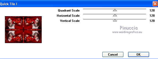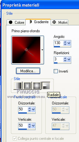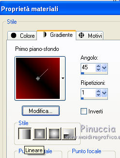 qui puoi trovare qualche risposta ai tuoi dubbi. Se l'argomento che ti interessa non è presente, ti prego di segnalarmelo. Questo tutorial è stato creato con PSP 9, ma può essere eseguito anche con le altre versioni di PSP. Per tradurlo ho usato Corel X. Occorrente: Materiale qui Filtri: Graphics Plus - Quick Tile qui Xero - Fritillary qui Imposta il colore di primo piano con #a70100, e il colore di sfondo con il nero. Passa il colore di primo piano a Gradiente radiale. ![]() Apri una nuova immagine trasparente 700 x 500 pixels, e riempila con il gradiente.Regola>Sfocatura>Sfocatura gaussiana - raggio 15. ![]() Effetti>Plugins>Xero - Fritillary, con i settaggi standard. ![]() Livelli>Nuovo livello raster. Riempi con il colore nero.Cambia i settaggi del gradiente da radiale a lineare: ![]() Riempi il livello con questo gradiente.Immagine>Ridimensiona, al 90%, tutti i livelli non selezionato. Selezione>Seleziona tutto. Selezione>Mobile. Selezione>Immobilizza. Apri il tube "bouche-18-tube-colombe". Immagine>Ridimensiona, all'80%. Modifica>Copia. Torna al tuo lavoro e vai a Modifica>Incolla come nuovo livello. Posiziona correttamente il tube a destra.Mantieni selezionato. Apri il tube krw2976 e vai a Modifica>Copia. Torna al tuo lavoro e vai a Modifica>Incolla come nuovo livello. Spostalo in basso.Mantieni sempre selezionato. Apri il tube della donna "GothWoman2". Immagine>Ridimensiona, al 90%, tutti i livelli non selezionato. Immagine>Rifletti. e vai a Modifica>Copia. Torna al tuo lavoro e vai a Modifica>Incolla come nuovo livello. Posiziona il tube a sinistra.Livelli>Duplica - 2 volte. Livelli>Unisci>Unisci giù - 2 volte. Mantieni ancora selezionato. Chiudi il livello inferiore dello sfondo. Livelli>Unisci>Unisci visibile. Selezione>Inverti. Premi sulla tastiera il tasto CANC. Selezione>Inverti. Effetti>Effetti 3D>Sfalsa ombra, con il colore nero. ![]() Ripeti l'Effetto Sfalsa ombra, cambiando verticale e orizzontale con -4. Selezione>Deseleziona. Regola>Messa a fuoco>Metti a fuoco. Riapri il livello di sfondo. Immagine>Aggiungi bordatura, 2 pixels, simmetriche, con il colore nero. Attiva lo strumento Selezione , rettangolo e seleziona una parte della rosa.![]() Modifica>Copia. Selezione>Deseleziona e metti da parte il lavoro per il momento. Apri una nuova immagine trasparente 300 x 300 pixels. Selezione>Seleziona tutto. Modifica>Incolla nella selezione. Effetti>Effetti di immagine>Motivo unico, con i settaggi standard. ![]() Livelli>Unisci>Unisci tutto. Modifica>Copia. Torna al lavoro principale. Immagine>Aggiungi bordatura, 20 pixels, simmetriche, con il colore bianco. Seleziona questo bordo con la bacchetta magica ![]() Modifica>Incolla nella selezione. Effetti>Plugins>Graphics Plus - Quick Tile I, con i settaggi standard. ![]() Effetti>Effetti 3D>Smusso a incasso. ![]() Selezione>Deseleziona. Immagine>Aggiungi bordatura, 1 pixel, simmetriche, con il colore nero. Immagine>Aggiungi bordatura, 1 pixel, simmetriche, con il colore rosso. Apri il tube "Diam" e vai a Modifica>Copia. Torna al tuo lavoro e vai a Modifica>Incolla come nuovo livello. Posiziona il tube in alto a sinistra.Livelli>Duplica. Immagine>Ruota per gradi - 90 gradi a destra. ![]() Spostalo per formare un angolo con il tube precedente.Livelli>Unisci>Unisci giù. Livelli>Duplica. Immagine>Rifletti. Immagine>Capovolgi. Livelli>Unisci>Unisci giù. Aggiungi il tuo nome e/o il tuo watermark su un nuovo livello. Livelli>Unisci>Unisci tutto e salva in formato jpg. ![]() Se hai problemi o dubbi, o trovi un link non funzionante, o anche soltanto per un saluto, scrivimi. 9 Gennaio 2010 |