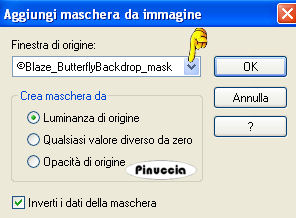 Apri il menu sotto la finestra di origine e vedrai la lista dei files aperti. Tra questi la maschera ©Blaze_ButterflyBackdrop_mask.