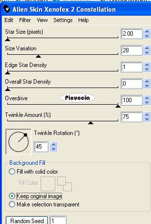 Ripeti l'Effetto Constellation con gli stessi settaggi, ma cliccando una volta su Random Seed.