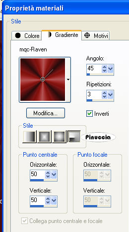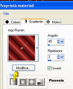 Passa il colore di primo piano a Gradiente, seleziona il gradiente mqc-Raven, con i seguenti settaggi.