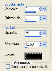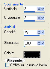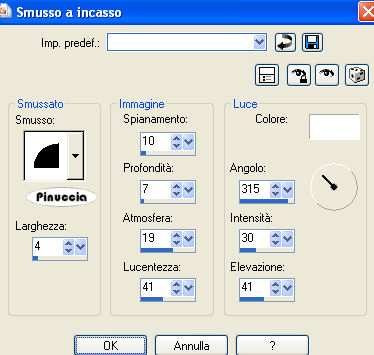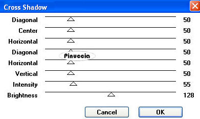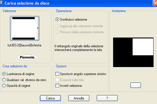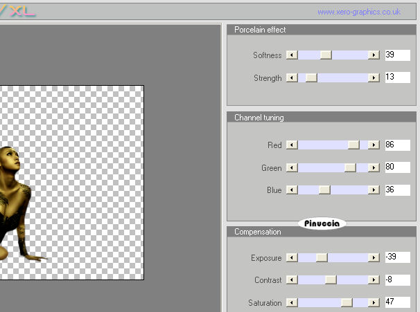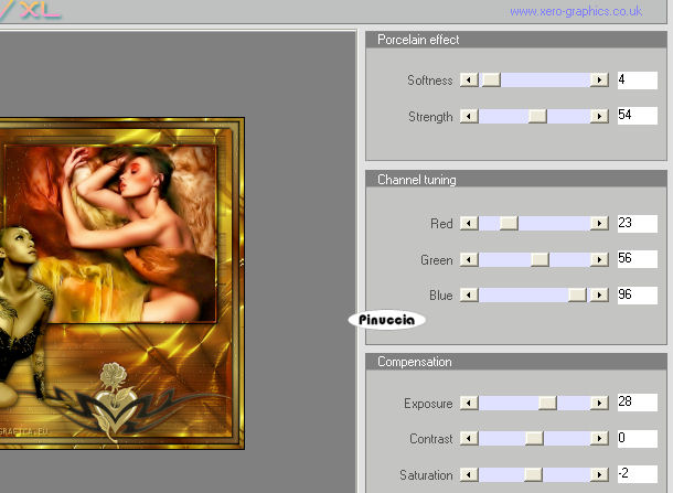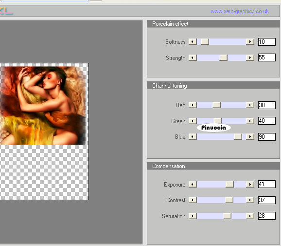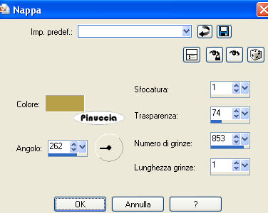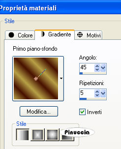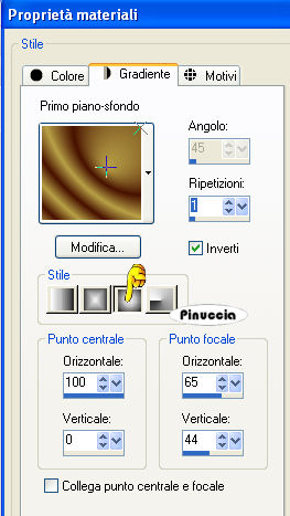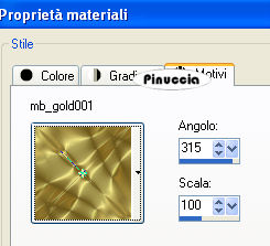qui puoi trovare qualche risposta ai tuoi dubbi. Se l'argomento che ti interessa non è presente, ti prego di segnalarmelo. Questo tutorial è stato creato con PSP 9, ma può essere eseguito anche con le altre versioni di PSP. Per tradurlo, ho usato PSP X. Questo tutorial è una creazione di ©Christa e non può essere copiato su altri siti nè essere offerto per il download. Lo stesso vale per la mia traduzione. Il materiale viene da vari gruppi di condivisione. Il copyright appartiene ai rispettivi autori. Grazie ai creatori dei tubes che mettono a disposizione il loro lavoro in vari gruppi di condivisione. Occorrente: Materiale qui Grazie Colombe , Crimson Moon Designs, Bienetre per i tubes. grazie Weescoltslass per il wordart. Rispetta il lavoro degli autori, non cambiare il nome del file e non cancellare il watermark. Filtri: Xero - Porcelain XL qui Graphics Plus - Cross Shadow qui ![]() Metti la maschera nella cartella Maschere. Metti la selezione nella cartella Selezioni. Apri il resto del materiale in PSP. 1. Apri una nuova immagine trasparente 760 x 560 pixels. Imposta il colore di primo piano con #471100, e il colore di sfondo con #b7a047. Passa il colore di primo piano a Gradiente. ![]() Riempi l'immagine trasparente con il gradiente.Regola>Sfocatura>Sfocatura gaussiana - raggio 25. ![]() Effetti>Effetti di trama>Nappa, con il colore chiaro. ![]() Effetti>Plugins>Graphics Plus - Cross Shadow: ![]() 3. Livelli>Nuovo livello raster. Passa il colore di primo piano a Motivi e seleziona il motivo mb_gold001: ![]() Riempi il livello con questo motivo.Cambia la modalità di miscelatura di questo livello in Luce netta. Livelli>Duplica e chiudi questo livello. Attiva nuovamente il livello Raster 2. ![]() Livelli>Carica/Salva maschera>Carica maschera da disco. Cerca e carica la maschera lightbreakingthru_mdw11: ![]() Livelli>Unisci>Unisci gruppo. Effetti>Effetti 3D>sfalsa ombra, con il colore nero. ![]() Selezione>Carica/Salva selezione>Carica selezione da disco. Cerca e carica la selezione tut383-2@ausw@christa. ![]() Selezione>Modifica>Seleziona bordature selezione. ![]() Livelli>Nuovo livello raster. Riempi con il colore scuro.Livelli>Nuovo livello raster. Riempi con il motivo oro.Cambia la modalità di miscelatura di questo livello in Luce netta. Regola>Messa a fuoco>Accentua messa a fuoco. Livelli>Unisci>Unisci giù. Effetti>Effetti 3D>Smusso a incasso. ![]() Selezione>Deseleziona. 3. Clicca con la bacchetta magica al centro della cornice per selezionarla.Selezione>Modifica>Espandi - 3 pixels. Livelli>Nuovo livello raster. Livelli>Disponi>Sposta giù. Riempi con il colore scuro.Effetti>Plugins>Graphics Plus - Cross Shadow. ![]() Effetti>Effetti di trama>Nappa, con i settaggi precedenti. Apri "CarolaMists_Glamour_AC" e vai a Modifica>Copia. Torna al tuo lavoro e vai a Modifica>Incolla come nuovo livello. Posiziona il tube nell'area della cornice.Selezione>Inverti. Premi sulla tastiera il tasto CANC. Selezione>Deseleziona. Effetti>Plugins>Xero - Porcelain XL. ![]() Attiva il livello della cornice. Livelli>Unisci>Unisci giù - 2 volte. Effetti>Effetti 3D>Sfalsa ombra, con il colore nero. ![]() Ripeti l'Effetto Sfalsa ombra, cambiando verticale e orizzontale con -3. Sposta l'immagine un po' più a sinistra e in basso.![]() 4. Apri "bouche-18-tube-colombe.pspimage" e vai a Modifica>Copia. Torna al tuo lavoro e vai a Modifica>Incolla come nuovo livello. Immagine>Ridimensiona, al 90%, tutti i livelli non selezionato. Sposta il tube in alto a sinistra.Cambia la modalità di miscelatura di questo livello in Sovrapponi, e abbassa l'opacità al 66%. Nella paletta dei livelli sposta questo livello sopra il livello Raster 1. ![]() 5. Attiva il livello Raster 3. Apri "w beauty body paint china.pspimage" e vai a Modifica>Copia. Torna al tuo lavoro e vai a Modifica>Incolla come nuovo livello. Sposta il tube in basso a sinistra.Attiva lo strumento Selezione , rettangolo,e seleziona l'interno della maschera. Selezione>Inverti. Premi sulla tastiera il tasto CANC. Questo passaggio è necessario se stai usando il mio tube (se stai usando un altro tube potrebbe non essere necessario). Attiva il livello della maschera. Effetti>Effetti 3D>Sfalsa ombra, con il colore nero. ![]() Ripeti l'Effetto Sfalsa ombra, cambiando verticale e orizzontale con -3. Selezione>Deseleziona. Attiva il livello del tube. Effetti>Plugins>Xero - Porcelain XL. ![]() Effetti>Effetti 3D>Sfalsa ombra, con i settaggi precedenti. Regola>Flash Riempimento - 2 volte. ![]() se stai usando PSP 9: Regola>Correzione fotografica>Flash Riempimento. In questa versione non esiste la voce Saturazione Regola>Messa a fuoco>Metti a fuoco. 6. Attiva il livello Raster 1. Selezione>Seleziona tutto. Immagine>Ritaglia la selezione. Immagine>Dimensione tela. ![]() Livelli>Nuovo livello raster. Livelli>Disponi>Porta sotto. Passa il colore di primo piano a Gradiente. ![]() Riempi il livello con il gradiente.Effetti>Plugins>Graphics Plus - Cross Shadow, con i settaggi precedenti. Effetti>Effetti di trama>Nappa, con i settaggi precedenti. Selezione>Seleziona tutto. Selezione>Modifica>Contrai - 5 pixels. Selezione>Inverti. Livelli>Nuovo livello raster. Livelli>Disponi>Porta in alto. Riempi con il motivo oro.Regola>Messa a fuoco>Accentua messa a fuoco. Cambia la modalità di miscelatura di questo livello in Luce netta. Effetti>Effetti 3D>Sfalsa ombra, con il colore nero. ![]() Ripeti l'Effetto Sfalsa ombra, cambiando verticale e orizzontale con -3. Selezione>Deseleziona. Attiva il livello Raster 1. Ripeti l'Effetto Sfalsa ombra, con i settaggi precedenti. Attiva il livello Raster 3. ![]() Apri "CM_TattoosRoseHeart 004.pspimage". Attiva il livello "mid heart" e vai a Modifica>Copia. Torna al tuo lavoro e vai a Modifica>Incolla come nuovo livello. Immagine>Ridimensiona, al 65%, tutti i livelli non selezionato. Sposta il tube in basso a destra.Regola>Tonalità e saturazione>Viraggio. ![]() Effetti>Plugins>Graphics Plus - Cross Shadow, con i settaggi precedenti. E
