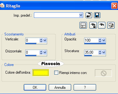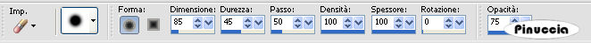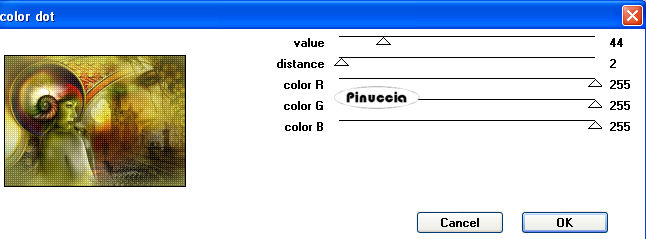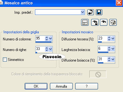 qui puoi trovare qualche risposta ai tuoi dubbi. Se l'argomento che ti interessa non è presente, ti prego di segnalarmelo. Questo tutorial è stato creato con PSP 9, ma può essere eseguito anche con le altre versioni di PSP. Per tradurlo, ho usato PSP X. Questo tutorial è una creazione di ©Christa e non può essere copiato su altri siti nè essere offerto per il download. Lo stesso vale per la mia traduzione. Il materiale viene da vari gruppi di condivisione. Il copyright appartiene ai rispettivi autori. Grazie ai creatori dei tubes che mettono a disposizione il loro lavoro in vari gruppi di condivisione. Occorrente: Materiale qui Per i tubes grazie Artemis, Nurso53, Benelol e Cristine Rispetta il lavoro degli autori, non cambiare il nome del file e non cancellare il watermark. Filtri: OptikVerve Lab- VirtualPhotographer qui FM Tile Tools - Blend Emboss qui Graphics Plus - Cross Shadow qui Funhouse - Radial Mirror qui Penta.com - Color dot qui ![]() 1. Apri una nuova immagine trasparente 900 x 650 pixels. Imposta il colore di primo piano con #a7a549, e il colore di sfondo con #6c6635. Riempi l'immagine trasparente con il colore di primo piano.Effetti>Plugins>Graphics Plus - Cross Shadow con i seguenti settaggi. ![]() Effetti>Plugins>Filters Unlimited 2.0 - Funhouse - Radial Mirror: ![]() Effetti>Plugins>FM Tile Tools - Blend Emboss, con i settaggi standard. ![]() 2. Apri "NS_118_0809.pspimage" e vai a Modifica>Copia. Torna al tuo lavoro e vai a Modifica>Incolla come nuovo livello. Sposta il tube in basso a destra.Cambia la modalità di miscelatura di questo livello in Luminanza (esistente). Apri "Goth2Mai08Bnll.pspimage" e vai a Modifica>Copia. Torna al tuo lavoro e vai a Modifica>Incolla come nuovo livello. Sposta il tube in basso.Livelli>Disponi>Sposta giù. Cambia la modalità di miscelatura di questo livello in Luminanza (esistente). ![]() Livelli>Unisci>Unisci giù. Effetti>Plugins>FM Tile Tools - Blend Emboss, con i settaggi standard. 3. Apri "goth1aSept07Bnll.pspimage" e vai a Modifica>Copia. Torna al tuo lavoro e vai a Modifica>Incolla come nuovo livello. Sposta il tube in alto a destra.![]() Cambia la modalità di miscelatura in Luce diffusa. Effetti>Plugins>FM Tile Tools - Blend Emboss, con i settaggi standard. 4. Apri "christmist_fractal_Art_08.pspimage". Livelli>Nuovo livello raster. Selezione>Seleziona tutto. Modifica>Incolla nella selezione. Selezione>Deseleziona. Immagine>Rifletti. Immagine>Capovolgi. Sposta il tube a sinistra.Cambia la modalità di miscelatura di questo livello in luce netta. ![]() Effetti>Plugins>FM Tile Tools - Blend Emboss, con i settaggi standard. Apri "fantasy16_aout2009_artemis.pspimage" e vai a Modifica>Copia. Torna al tuo lavoro e vai a Modifica>Incolla come nuovo livello. Immagine>Rifletti. Immagine>Ridimensiona, al 75%, tutti i livelli non selezionato. Sposta il tube a sinistra, nella cerchio.![]() Cambia la modalità di miscelatura di questo livello in Luminanza (esistente). Attiva lo strumento Gomma con i seguenti settaggi:![]() Attiva il livello del frattale e cancella le tracce di questo tube dal viso e dal corpo della donna. ![]() Livelli>Unisci>Unisci tutto. Effetti>Plugins>Penta.com - color Dot. ![]() 5. Immagine>Ridimensiona - 800 pixels di larghezza: ![]() Regola>Messa a fuoco>Metti a fuoco. Immagine>Aggiungi bordatura, 1 pixel, simmetriche, con il colore di primo piano. Modifica>Copia. Immagine>Aggiungi bordatura, 10 pixels, simmetriche, con il colore di sfondo. Seleziona questo bordo con la bacchetta magica , sfumatura e tolleranza 0,Effetti>Plugins>Graphics Plus - Cross Shadow, con i settaggi standard. ![]() Effetti>Plugins>Penta.com - Color dot, con i settaggi precedenti. Immagine>Aggiungi bordatura, 1 pixel, simmetriche, con il colore di primo piano. Immagine>Aggiungi bordatura, 25 pixels, simmetriche, con il colore di sfondo. Seleziona questo bordo con la bacchetta magica ![]() Effetti>Plugins>Graphics Plus - Cross Shadow, con i settaggi precedenti. Livelli>Nuovo livello raster. Modifica>Incolla nella selezione. Cambia la modalità di miscelatura di questo livello in Luce netta. Effetti>Effetti 3D>Scalpello, con i seguenti settaggi, colore #ffff00. ![]() Effetti>Effetti di trama>Mosaico Antico. ![]() Selezione>Deseleziona. Aggiungi il tuo testo e il tuo watermark su un nuovo livello. Unisci>Unisci tutto. Effetti>Plugins>OptikVerve Labs-VirtualPhotographer: ![]() Salva in formato jpg. Se hai problemi o dubbi, o trovi un link non funzionante, o anche soltanto per un saluto, scrivimi. 27 Agosto 2009 |