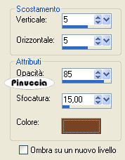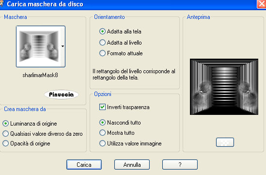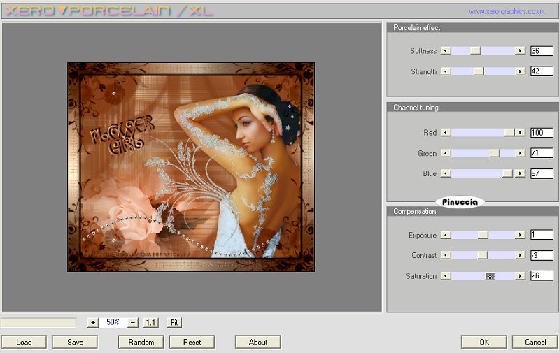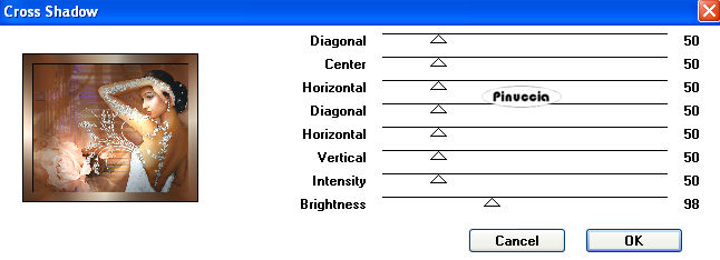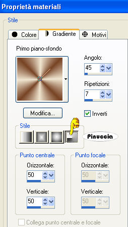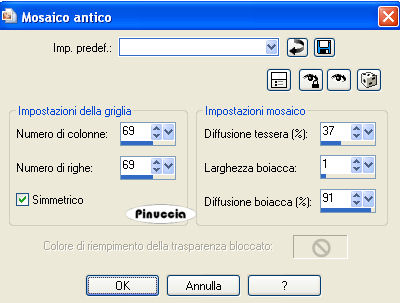 qui puoi trovare qualche risposta ai tuoi dubbi. Se l'argomento che ti interessa non è presente, ti prego di segnalarmelo. Questo tutorial è stato creato con PSP 9, ma può essere eseguito anche con le altre versioni di PSP. Per tradurlo, ho usato PSP X. Questo tutorial è una creazione di ©Christa e non può essere copiato su altri siti nè essere offerto per il download. Lo stesso vale per la mia traduzione. Il materiale viene da vari gruppi di condivisione. Il copyright appartiene ai rispettivi autori. Grazie ai creatori dei tubes che mettono a disposizione il loro lavoro in vari gruppi di condivisione. Rispetta il lavoro degli autori, non cambiare il nome del file e non cancellare il watermark. Occorrente: Materiale qui Per il materiale grazie Guismo, Sharlimar e Solenero73. Filtri: Sapphire Filters 03 - Sapphire Plugins 0238 qui Graphics Plus - Cross Shadow qui Xero - Porcelain XL qui ![]() Metti la maschera nella cartella Maschere. Apri il resto del materiale, e minimizza tutto. 1. Apri una nuova immagine trasparente 700 x 580 pixels. Imposta il colore di primo piano con il colore chiaro #f0e5d0, e il colore di sfondo con il colore scuro #774325. Passa il colore di primo piano a Gradiente: ![]() Riempi l'immagine trasparente con il gradiente.Regola>Sfocatura>Sfocatura gaussiana - raggio 15. ![]() Effetti>Plugins>Sapphire Filters 03 - Sapphire Plugin 0238: ![]() 2. Livelli>Nuovo livello raster. Riempi con il colore scuro.Livelli>Carica/Salva maschera>Carica maschera da disco. Cerca e carica la maschera KL227: ![]() Livelli>Unisci>Unisci gruppo. Effetti>effetti di bordo>Aumenta. Livelli>Duplica. Livelli>Unisci>Unisci giù. Rinomina questo livello "maschera1". Livelli>Nuovo livello raster. Riempi nuovamente con il colore scuro.Livelli>Carica/Salva maschera>Carica maschera da disco. Cerca e carica la maschera SharlimarMask8: ![]() Livelli>Unisci>Unisci gruppo. Nella paletta dei livelli sposta questo livello sotto il livello "maschera 1". 3. Apri il tube "calguisglamour719.pspimage" e vai a Modifica>Copia. Torna al tuo lavoro e vai a Modifica>Incolla come nuovo livello. Immagine>Ridimensiona, al 75%, tutti i livelli non selezionato. Sposta il tube a sinistra, sul bordo.Nella paletta dei livelli sposta questo livello sopra il livello Raster 1. Abbassa l'opacità di questo livello al 38%. ![]() Attiva il livello "maschera1". Modifica>Incolla come nuovo livello (il tube è ancora in memoria). Immagine>Rifletti. Immagine>Ridimensiona, al 70%, tutti i livelli non selezionato. Sposta il tube a destra, sul bordo.Regola>Messa a fuoco>Metti a fuoco. Effetti>Effetti 3D>sfalsa ombra con il colore scuro. ![]() Ripeti l'Effetto Sfalsa ombra, cambiando verticale e orizzontale con -5. 4. Apri il tube "diamond doodle1.pspimage" e vai a Modifica>Copia. Torna al tuo lavoro e vai a Modifica>Incolla come nuovo livello. Posiziona il tube sulla donna, come nel mio esempio.![]() Apri il tube "rose_present.pspimage" e vai a Modifica>Copia. Torna al tuo lavoro e vai a Modifica>Incolla come nuovo livello. Posiziona il tube in basso a sinistra.Nella paletta dei livelli sposta questo livello sotto il livello del doodle. ![]() Regola>Tonalità e saturazione>Viraggio, con i valori corrispondenti al colore scuro. (Sul Viraggio vedi qui). Regola>Messa a fuoco>Metti a fuoco. Livelli>Unisci>Unisci tutto. Imamgine>Aggiungi bordatura, 1 pixel, simmetriche, con il colore nero. Imamgine>Aggiungi bordatura, 40 pixels, simmetriche, con il colore bianco. Seleziona il bordo bianco con la bacchetta magica ![]() e riempilo con il gradiente.Effetti>Plugins>Graphics Plus - Cross shadow. ![]() Selezione>Modifica>Contrai - 7 pixels. Effetti>Effetti di trama>Mosaico antico. ![]() Selezione>Modifica>Espandi - 7 pixels. Selezione>Inverti. Effetti>Effetti 3D>sfalsa ombra, con il colore nero. ![]() Ripeti l'Effetto Sfalsa ombra, cambiando verticale e orizzontale con -5. Selezione>Deseleziona. 5. Apri il tube "Floral_Brushes...." e vai a Modifica>Copia. Torna al tuo lavoro e vai a Modifica>Incolla come nuovo livello. Spostalo nell'angolo in alto a sinistra.Cambia la modalità di miscelatura di questo livello in Luminanza (esistente). Livelli>Duplica. Immagine>Rifletti. Livelli>Unisci>Unisci giù. Livelli>Duplica. Immagine>Capovolgi. Livelli>Unisci>Unisci giù. Apri "silver 1.pspimage" e vai a Modifica>Copia. Torna al tuo lavoro e vai a Modifica>Incolla come nuovo livello. Spostalo in basso al centro, sopra il bordo.Apri "diamant" e vai a Modifica>Copia. Torna al tuo lavoro e vai a Modifica>Incolla come nuovo livello e posiziona il diamante su uno dei fiori.![]() Modifica>Incolla come nuovo livello e posiziona il secondo diamante sull'altro fiore. Attiva lo strumento Testo , scegli un font, o usa quello fornito, e scrivi un testo sull'immagine.Per il mio esempio ho usato il font Medieval, colore di primo piano il colore scuro e colore di sfondo il gradiente. Effetti>Effetti 3D>Sfalsa ombra. ![]() Aggiungi il tuo nome e/o il tuo watermark su un nuovo livello. Livelli>Unisci>Unisci tutto. Effetti>Plugins>Xero - Porcelain XL, puoi scegliere il settaggio cliccando su Random finchè - nella finestra di anteprima - non vedi il risultato che ti soddisfa. I miei settaggi. ![]() la versione XL non funziona se non viene rimossa dalle Preferenze Files la versione precedente. Selezione>Seleziona tutto. Selezione>Modifica>Contrai - 2 pixels. Selezione>Inverti. Riempi con il colore nero.Hai finito. Salva il tuo lavoro in formato jpg. Se hai problemi o dubbi, o trovi un link non funzionante, o anche soltanto per un saluto, scrivimi. 28 Ottobre 2009 |