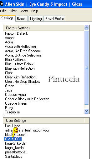 Metti il preset Glass_CG.f1s nella cartella del filtro sotto Alien Skin Eye CAndy 5 Impact>Settings>Glass. Se preferisci, puoi importarlo - quando ti servirà - direttamente dalla cartella in cui hai scompattato il materiale.