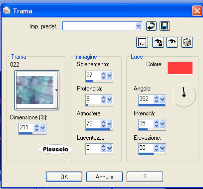 Effetti>Effetti di trama>Trama, seleziona la trama 022 con i seguenti settaggi e con un colore scelto dall'immagine; il mio #ff4040.