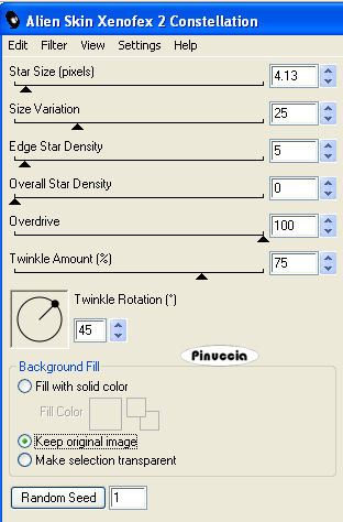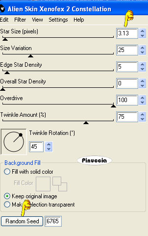 Effetti>Plugins>Alien skin Xenofex 2.0 - Constellation, cambiando Star Size con 3,13 e cliccando una volta su Random Seed.