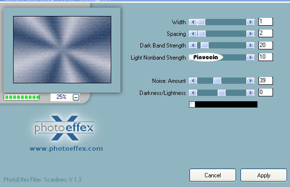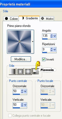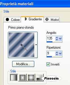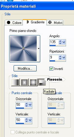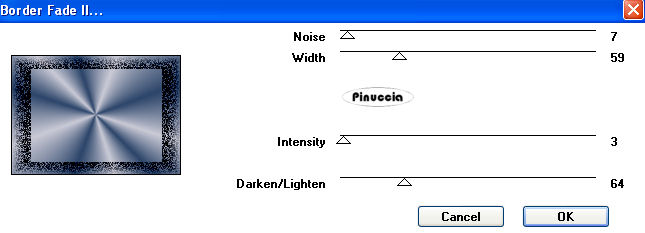 qui puoi trovare qualche risposta ai tuoi dubbi. Se l'argomento che ti interessa non è presente, ti prego di segnalarmelo. Questo tutorial è stato creato con PSP 9, ma può essere eseguito anche con le altre versioni di PSP. Per tradurlo, ho usato PSP X. Questo tutorial è una creazione di ©Christa e non può essere copiato su altri siti nè essere offerto per il download. Lo stesso vale per la mia traduzione. Il materiale viene da vari gruppi di condivisione. Il copyright appartiene ai rispettivi autori. Grazie ai creatori dei tubes che mettono a disposizione il loro lavoro in vari gruppi di condivisione. Occorrente: Materiale qui Il tube principale è di Sandra alias ©Venja-Art, che ringrazio per il permesso. Attenzione, i suoi lavori non possono essere usati senza permesso. Grazie anche Sabi per il suo tube. Rispetta il lavoro degli autori, non cambiare il nome del file e non cancellare il watermark. Filtri: FM Tile Tools - Blend Emboss qui Alfs's Border FX - Border Fade II qui Graphics Plus - Cross Shadow qui Xero - Porcelain qui Xero - Improver qui Photo Effex - Scanlines qui ![]() Apri tutto il materiale in PSP. Duplicalo usando sulla tastiera la combinazione di tasti maiuscola+D e chiudi gli originali. 1. Apri una nuova immagine trasparente 800 x 550 pixels. Scegli un colore chiaro e un colore scuro dai tuoi tubes. Imposta il colore di primo piano con il colore chiaro #cbcbd7, e il colore di sfondo con il colore scuro #2c456a. Passa il colore di primo piano a Gradiente: ![]() Riempi l'immagine trasparente con il gradiente.Regola>Sfocatura>Sfocatura gaussiana - raggio 20. ![]() Effetti>Plugins>Photo Effex - Scanlines; eventualmente, se stai usando altri colori, sperimenta il settaggio più adatto a questi: ![]() Livelli>Nuovo livello raster. Selezione>Seleziona tutto. Apri l'immagine di sfondo Photo-Art-of-Yaga-Kielb, e vai a Modifica>Copia. Torna al tuo lavoro e vai a Modifica>Incolla nella selezione. Selezione>Deseleziona. Livelli>Nuovo livello maschera>Da immagine. Apri il menu sotto la finestra di origine e vedrai la lista dei files aperti; tra questi Maske HalloweenHaunting.jpg. Seleziona la maschera con i seguenti settaggi. ![]() Livelli>Unisci>Unisci gruppo. Regola>Tonalità e Saturazione>Viraggio, con i valori corrispondenti al colore scuro o al colore chiaro (a te la scelta). Questo il mio settaggio: ![]() Effetti>Plugins>FM Tile Tools - Blend Emboss, con i settaggi standard. ![]() Apri il primo tube: Copy_by_Venja_Art_Wizard_AND_Witches_1.psp e vai a Modifica>Copia. Torna al tuo lavoro e vai a Modifica>Incolla come nuovo livello. Immagine>Ridimensiona, all'80%, tutti i livelli non selezionato. Sposta il tube a sinistra.Eventualmente, se stai usando altri colori, colorizza il tube. Cambia la modalità di miscelatura di questo livello in Filtra. Attenzione, con un altro tube potrebbe essere necessario sperimentare una modalità più adatta. ![]() Apri il tube principale: "Copie_by_Venja-Art_Die_Magie_Der_Nachtelfen.psp" e vai a modifica>Copia. Torna al tuo lavoro e vai a Modifica>Incola come nuovo livello. Se stai usando un altro tube: Immagine>Ridimensiona, se e quanto necessario (nel mio esempio ho ridimensionato al 70%). In questo caso non dimenticare di mettere a fuoco. Sposta il tube a destra.![]() Effetti>Effetti 3D>sfalsa ombra, con il colore nero. ![]() Ripeti l'Effetto Sfalsa ombra, con i seguenti settaggi. ![]() Livelli>Unisci>Unisci visibile. Effetti>Plugins>Xero - Porcelain, con i settaggi standard. ![]() Selezione>Seleziona tutto. Selezione>Modifica>Contrai - 5 pixels. Selezione>Inverti. Cambia lo stile del gradiente a lineare. ![]() Riempi la selezione con il gradiente.Effetti>Plugins>Graphics Plus - Cross Shadow, con i settaggi standard - 2 volte. ![]() Selezione>Inverti. Livelli>Nuovo livello raster. Effetti>Effetti 3D>Ritaglio, con il colore scuro. ![]() Ripeti l'Effetto Ritaglio, cambiando verticale e orizzontale con -5. Selezione>Deseleziona. Livelli>Unisci>Unisci visibile. Immagine>Dimensione tela: ![]() Livelli>Nuovo livello raster. Livelli>Disponi>Porta sotto. Cambia lo stile del gradiente a Radiale. ![]() Riempi il livello con il gradiente.Effetti>Plugins>Alf's Border FX - Border Fade II. ![]() Immagine>Aggiungi bordatura, 1 pixel, simmetriche, con il colore nero. Effetti>Plugins>Xero - Improver: ![]() Aggiungi il testo o un tube accessorio su un nuovo livello. Non dimenticare il tuo nome e/o il tuo watermark. Livelli>Unisci>Unisci tutto e salva in formato jpg. Se hai problemi o dubbi, o trovi un link non funzionante, o anche soltanto per un saluto, scrivimi. 20 Settembre 2009 |