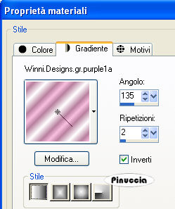 Passa il colore di primo piano a Gradiente e seleziona il gradiente WinniDesign.gr.purple 1a, con i seguenti settaggi.