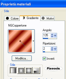 Passa il colore di primo piano a Gradiente, e seleziona il gradiente NGCoppertone con i seguenti settaggi.