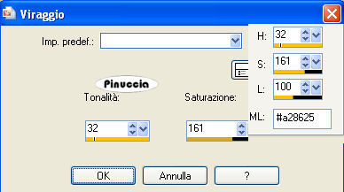 Regola>Tonalità e saturazione>Viraggio, con i valori di tonalità e saturazione del colore scuro: