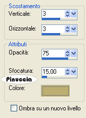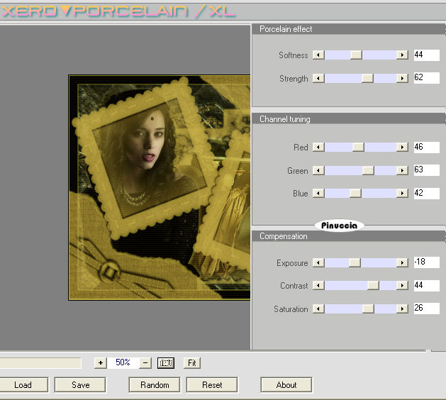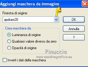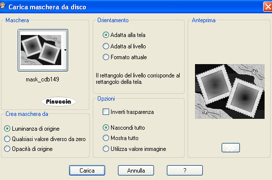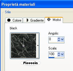 qui puoi trovare qualche risposta ai tuoi dubbi. Se l'argomento che ti interessa non è presente, ti prego di segnalarmelo. Questo tutorial è stato creato con PSP 9, ma può essere eseguito anche con le altre versioni di PSP. Per tradurlo, ho usato PSP X. Questo tutorial è una creazione di ©Christa e non può essere copiato su altri siti nè essere offerto per il download. Lo stesso vale per la mia traduzione. Il materiale viene da vari gruppi di condivisione. Il copyright appartiene ai rispettivi autori. Grazie ai creatori dei tubes che mettono a disposizione il loro lavoro in vari gruppi di condivisione. Occorrente: Materiale qui Per i tubes grazie Margit, e a Luz Cristina. Rispetta il lavoro degli autori, non cambiare il nome del file e non cancellare il watermark. Filtri: Xero XL - Porcelain qui ![]() Metti la maschera mask_cdb149 nella cartella Maschere. Apri invece la maschera apdraw20.jpg in PSP, insieme al resto del materiale. 1. Apri una nuova immagine trasparente 750 x 580 pixels. Passa il colore di primo piano e seleziona il motivo "black" con i seguenti settaggi: ![]() Livelli>Nuovo livello raster. Imposta il colore di primo piano con un colore abbinato a quelli dei tuoi tubes. Il mio #bdae71. Riempi il livello con questo colore.2. Apri il tube "1102_luzcristina.pspimage" e vai a Modifica>Copia. Torna al tuo lavoro e vai a Modifica>Incolla come nuovo livello. Posiziona il tube un po' più in basso a destra.considera questa posizione nel caso volessi usare un altro tube; eventualmente sposta il tube un po' più vicino al bordo Il mio esempio: ![]() Livelli>Unisci>Unisci giù. Livelli>Nuovo livello maschera>Da immagine. Apri il menu sotto la finestra di origine e vedrai la lista dei files aperti. Tra questi la maschera apdraw20.jpg. Seleziona la maschera con i seguenti settaggi: ![]() Livelli>Unisci>Unisci gruppo. Regola>Messa a fuoco>Metti a fuoco. 3. Apri "MMDesignz_Cr001128.pspimage" e vai a Modifica>Copia. Torna al tuo lavoro e vai a Modifica>Incolla come nuovo livello. Immagine>Ridimensiona, al 60%, tutti i livelli non seleizonato. Sposta il tube a sinistra.Regola>Messa a fuoco>Metti a fuoco. Effetti>Effetti 3D>Sfalsa ombra, con il colore chiaro. ![]() Livelli>Unisci>Unisci tutto. 4. Immagine>Aggiungi bordatura, 2 pixels, simmetriche, con il colore chiaro. Immagine>Aggiungi bordatura, 25 pixels, simmetriche, con il colore nero. Livelli>Nuovo livello raster. Riempi con il colore chiaro usato al punto 1 (o scegli un altro colore).Livelli>Carica/Salva maschera>Carica maschera da disco. Cerca e carica la maschera mask_cdb149. ![]() Livelli>Unisci>Unisci gruppo. Livelli>Unisci>Unisci tutto. Selezione>Seleziona tutto. Selezione>Modifica>Contrai - 2 pixels. Selezione>Inverti. Riempi con il colore chiaro.Selezione>Deseleziona. Effetit>Plugins>Xero - Porcelain XL: puoi premere il tasto Random (per scegliere il risultato che preferisci - controllandolo nella finestra di anteprima), o impostare i settaggi del mio esempio. ![]() Apri il file con il testo (o, se preferisci, usa un tuo testo) e vai a Modifica>Copia. Torna al tuo lavoro e vai a Modifica>incolla come nuovo livello. Posiziona il testo correttamente.Aggiungi un leggero Effetto Sfalsa ombra. Aggiungi il tuo nome e/o il tuo watermark su un nuovo livello. Livelli>Unisci>Unisci tutto e salva in formato jpg. ![]() se vuoi usare il mio testo italiano prendilo qui Se hai problemi o dubbi, o trovi un link non funzionante, o anche soltanto per un saluto, scrivimi. 4 Settembre 2009 |