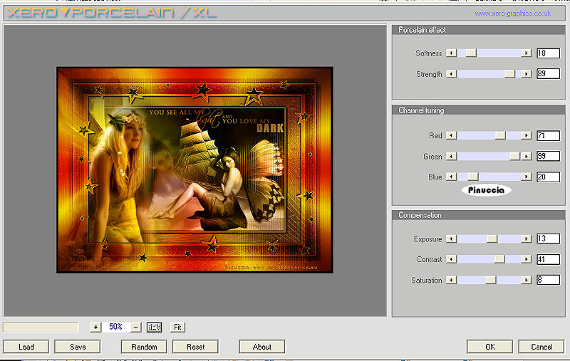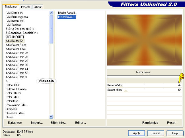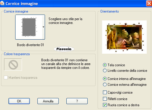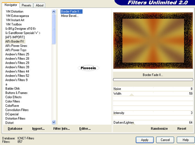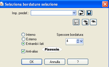 qui puoi trovare qualche risposta ai tuoi dubbi. Se l'argomento che ti interessa non è presente, ti prego di segnalarmelo. Questo tutorial è stato creato con PSP 9, ma può essere eseguito anche con le altre versioni di PSP. Per tradurlo, ho usato PSP X. Questo tutorial è una creazione di ©Christa e non può essere copiato su altri siti nè essere offerto per il download. Lo stesso vale per la mia traduzione. Il materiale viene da vari gruppi di condivisione. Il copyright appartiene ai rispettivi autori. Grazie ai creatori dei tubes che mettono a disposizione il loro lavoro in vari gruppi di condivisione. Occorrente: Materiale qui Per i tubes grazie Bibiche , Devilinside e VPC. Rispetta il lavoro degli autori, non cambiare il nome del file e non cancellare il watermark. Filtri: Filters Unlimited 2.0 qui Alf's Border FX qui Xero - Bad Dream e Porcelain XL qui ![]() Metti il Gradiente vbs4p nella cartella Gradienti. Con il materiale è fornita anche la cornice-immagine Spaßrand01, che è la corrispondente cornice standard in PSP Bordo divertente01. Se non hai la cornice standard metti questa nella cartella Cornici immagine. Apri il resto del materiale in PSP. 1. Apri una nuova immagine trasparente 700 x 480 pixels. Imposta il colore di primo piano con il Gradiente Vbs49: ![]() Imposta il colore di sfondo con il nero. Riempi l'immagine trasparente con il gradiente.Regola>Sfocatura>Sfocatura gaussiana - raggio 25. ![]() Effetti>Plugins>Filters Unlimited - Alf's Border FX - Mirror Bevel: ![]() Attiva lo strumento Selezione , rettangolo,e seleziona la parte centrale dell'immagine. ![]() 2. Livelli>Nuovo livello raster. Apri "hg_cg.pspimage" e vai a Modifica>Copia. Torna al tuo lavoro e vai a Modifica>Incolla nella selezione. Cambia la modalità di miscelatura di questo livello in Luce diffusa. Effetti>Effetti di bordo>Aumenta. Selezione>Modifica>Seleziona bordature selezione: ![]() Livelli>Nuovo livello raster. Riempi il livello con il colore nero.Effetti>Effetti 3D>Smusso a incasso. ![]() Cambia la modalità di miscelatura di questo livello in Luminanza (esistente). Effetti>Effetti 3D>Sfalsa ombra, con il colore nero. ![]() Ripeti l'Effetto Sfalsa ombra, cambiando verticale e orizzontale con -2. 3. Attiva il livello Raster 2. Selezione>Seleziona tutto. Selezione>Mobile. Selezione>Immobilizza. Livelli>Nuovo livello raster. Apri "ATT01067.jpg" e vai a Modifica>Copia. Torna al tuo lavoro e vai a Modifica>Incolla nella selezione. Cambia la modalità di miscelatura di questo livello in Luce netta. Effetti>Effetti di bordo>Aumenta. Apri "VPC_ButterFlyLady.pspimage" e vai a Modifica>Copia. Torna al tuo lavoro e vai a Modifica>Incolla come nuovo livello. Immagine>Ridimensiona, al 70%, tutti i livelli non selezionato. Sposta il tube a destra, nella cornice.![]() Regola>Messa a fuoco>Metti a fuoco. Apri "aaabibichegothique540.pspimage" e vai a Modifica>Copia. Torna al tuo lavoro e vai a Modifica>Incolla come nuovo livello. Sposta il tube nella cornice, a sinistra.Livelli>Disponi>Sposta giù. Cambia la modalità di miscelatura di questo livello in Luminanza (esistente). ![]() Selezione>Inverti. Premi sulla tastiera il tasto CANC. Selezione>Deseleziona. Chiudi il livello Raster 1. Livelli>Unisci>Unisci visibile. Riapri il livello Raster 1 e cambia la modalità di miscelatura del livello Uniti in Luminanza (esistente). ![]() 4. Livelli>Nuovo livello raster. Selezione>Seleziona tutto. Livelli>Disponi>Sposta giù. Apri "Side Scenes_Natalia Jeshoa 1.jpg" e vai a Modifica>Copia. non chiuderlo perchè ti servirà ancora Torna al tuo lavoro e vai a Modifica>Incolla nella selezione. Cambia la modalità di miscelatura di questo livello in Luce diffusa. Effetti>Effetti di bordo>Aumenta di più. Selezione>Deseleziona. Livelli>Unisci>Unisci tutto. Immagine>Aggiungi bordatura, 4 pixels, simmetriche, con il colore nero. Livelli>Innalza livello di sfondo. Immagine>Dimensione tela: ![]() Livelli>Nuovo livello raster. Livelli>Disponi>Sposta giù. Riempi con il gradiente.Regola>Sfocatura>Sfocatura gaussiana - raggio 25. ![]() Effetti>Plugins>Filters Unlimited - Alf's Border FX - Border Fade II. ![]() Attiva il livello Raster 1. Effetti>Effetti 3D>Sfalsa ombra, con il colore nero. ![]() Ripeti l'Effetto Sfalsa ombra, cambiando verticale e orizzontale con -10. Livelli>Unisci>Unisci tutto. Immagine>Aggiungi bordatura, 4 pixels, simmetriche, con il colore nero. Livelli>Innalza livello di sfondo. 5. Immagine>Dimensione tela: ![]() Livelli>Nuovo livello raster. Livelli>Disponi>Sposta giù. Riempi con il gradiente.Regola>Sfocatura>Sfocatura gaussiana - raggio 25. ![]() Livelli>Nuovo livello raster. Selezione>Seleziona tutto. Attiva nuovamente "Side Scenes_Natalia Jeshoa 1.jpg". Immagine>Ruota a destra. se stai usando PSP 9: Immagine>Ruota>90 gradi in senso orario. Modifica>Copia. Torna al tuo lavoro e vai a Modifica>Incolla nella selezione. Selezione>Deseleziona. Cambia la modalità di miscelatura di questo livello in Luce diffusa. Effetti>Effetti di bordo>Aumenta. Attiva il livello Raster 1. Effetti>Effetti 3D>Sfalsa ombra, come al punto 4. Apri "Devilsinside_Exclusiv_106_2009.pspimage" e vai a Modifica>Copia. Torna al tuo lavoro e vai a Modifica>Incolla come nuovo livello. Sposta il tube a sinistra.Effetti>Plugins>Xero - Bad Dream XL: ![]() la versione xl non funziona se non viene rimossa dalle Preferenze files la versione precedente 6. Apri "rustikal_cg.pspimage" e vai a Modifica>Copia. Torna al tuo lavoro e vai a Modifica>Incolla come nuovo livello. Livelli>Disponi>Sposta giù. Livelli>Unisci>Unisci tutto. Immagine>Cornice-immagine: seleziona la cornice Bordo divertente 01: (se non hai questa cornice usa Spaßrand01 fornita con il materiale) ![]() Seleziona con la bacchetta magica il bordo bianco,e riempilo con il gradiente.Cambia la modalità di miscelatura di questo livello in Luce netta. Selezione>Deseleziona. Effetti>Effetti di bordo>Aumenta. Effetti>Effetti 3D>Sfalsa ombra, con il colore nero. ![]() Ripeti l'Effett