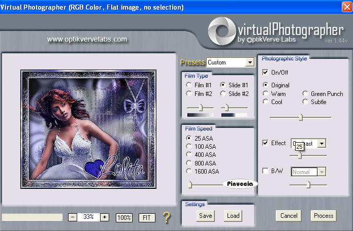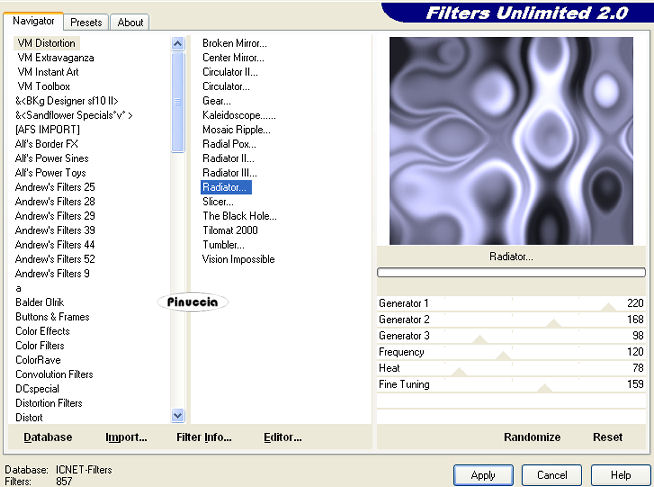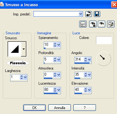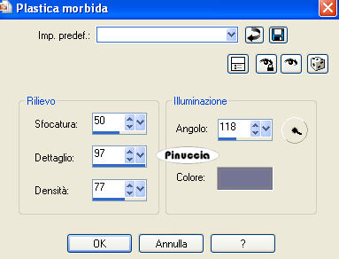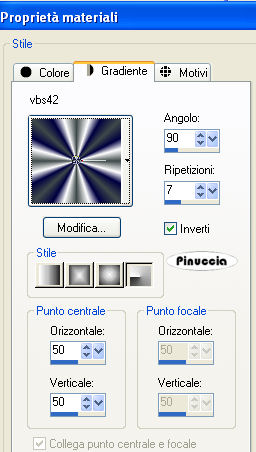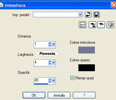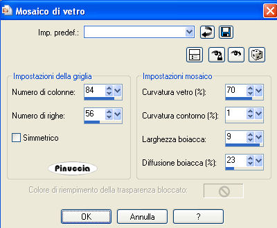 qui puoi trovare qualche risposta ai tuoi dubbi. Se l'argomento che ti interessa non è presente, ti prego di segnalarmelo. Questo tutorial è stato creato con PSP 9, ma può essere eseguito anche con le altre versioni di PSP. Per tradurlo, ho usato PSP X. Questo tutorial è una creazione di ©Christa e non può essere copiato su altri siti nè essere offerto per il download. Lo stesso vale per la mia traduzione. Il materiale viene da vari gruppi di condivisione. Il copyright appartiene ai rispettivi autori. Grazie ai creatori dei tubes che mettono a disposizione il loro lavoro in vari gruppi di condivisione. Occorrente: Materiale qui Per i tubes grazie Kumkumette. Rispetta il lavoro degli autori, non cambiare il nome del file e non cancellare il watermark. Filtri: Graphics Plus qui Filters Unlimited 2.0 qui VM Distortion - Radiator qui Xero - Improver qui OptikVerveLabs - Virtual Photographer qui ![]() Metti il Gradiente vbs42 nella cartella Gradienti. Apri il resto del materiale, compresa la maschera, in PSP. 1. Apri una nuova immagine trasparente 700 x 600 pixels. Imposta il colore di primo piano con il Gradiente Vbs42: ![]() Imposta il colore di sfondo con #747594. Riempi l'immagine trasparente con il colore di sfondo.Effetti>Plugins>Graphics Plus - Cross Shadow, con i settaggi standard. ![]() Effetti>Plugins>Filters Unlimited - VM Distortion - Radiator: ![]() Livelli>Nuovo livello raster. Riempi il livello con il gradiente.Regola>Sfocatura>Sfocatura gaussiana - raggio 25. ![]() Livelli>Nuovo livello maschera>Da immagine. Apri il menu sotto la finestra di origine e vedrai la lista dei files aperti. Seleziona la maschera WSL_Mask232 con i seguenti settaggi: ![]() Livelli>Unisci>Unisci gruppo. Livelli>Duplica, e attiva il livello sottostante della maschera originale. Effetti>Effetti di trama>Mosaico di vetro. ![]() Attiva il livello soprastante della copia. 3. Apri "Tube 91230309.pspimage" e vai a Modifica>Copia. Torna al tuo lavoro e vai a Modifica>Incolla come nuovo livello. Nella paletta dei livelli clicca sul numero 1 per togliere il collegamento. ![]() Livelli>Duplica. Immagine>Rifletti. Sposta questo tube a destra, contro il bordo.Nella paletta dei livelli sposta il livello sotto il livello della copia della maschera, e cambia la modalità di miscelatura in Luce diffusa. ![]() Effetti>Effetti di bordo>Aumenta. Attiva il livello superiore (il tube originale). Immagine>Ridimensiona, al 90%, tutti i livelli non selezionato. Sposta il tube in basso a sinistra.Effetti>Effetti 3D>Sfalsa ombra, con il colore nero. ![]() Effetti>Plugins>Xero - Improver. ![]() 4. Apri "calguisbijoux699.pspimage" e vai a Modifica>Copia. Torna al tuo lavoro e vai a Modifica>Incolla come nuovo livello. Immagine>Ridimensiona, al 30%, tutti i livelli non selezionato. Regola>Tonalità e saturazione>Viraggio, con i valori corrispondenti al colore di sfondo. I miei settaggi: ![]() Effetti>Effetti 3D>Sfalsa ombra, con il colore nero. ![]() Sposta il tube in alto a destra.Livelli>Unisci>Unisci tutto. 5. Immagine>Aggiungi bordatura, 10 pixels, simmetriche, con il colore bianco. Seleziona questo bordo con la bacchetta magica ![]() e riempilo con il gradiente.Effetti>Effetti di trama>Intessitura (colore intessitura con il colore di sfondo). ![]() Effetti>Effetti 3D>Smusso a incasso. ![]() Selezione>Inverti. Livelli>Nuovo livello raster. Effetti>Effetti 3D>Ritaglio. ![]() Selezione>Deseleziona. Livelli>Unisci>Unisci tutto. Modifica>Copia. 6. Immagine>Aggiungi bordatura, 40 pixels, simmetriche, con il colore grigio. Seleziona questo bordo con la bacchetta magica ![]() Livelli>nuovo livello raster. Modifica>Incolla nella selezione. Selezione>Seleziona tutto. Selezione>Modifica>Contrai - 10 pixels. Effetti>Effetti di trama>Plastica morbida (con il colore di sfondo). ![]() Effetti>Effetti di bordo>Aumenta. Selezione>Deseleziona. Apri il file con il testo e vai a Modifica>Copia. Torna al tuo lavoro e vai a Modifica>Incolla come nuovo livello. Posiziona il testo in basso a destra.Cambia la modalità di miscelatura di questo livello in Luce netta. Aggiungi il tuo nome e/o il tuo watermark su un nuovo livello. Livelli>Unisci>Unisci tutto. Effetti>Plugins>OptikVerve Lab - Virtual Photographer: ![]() Se hai problemi o dubbi, o trovi un link non funzionante, o anche soltanto per un saluto, scrivimi. 22 Ottobre 2009 |