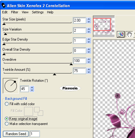 Ripeti l'Effetto Constellation con gli stessi settaggi, ma cliccando una volta su Random Seed.