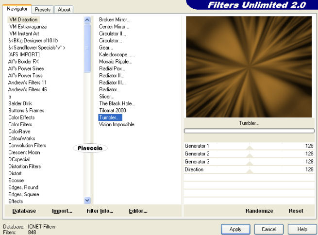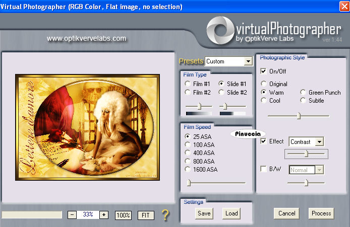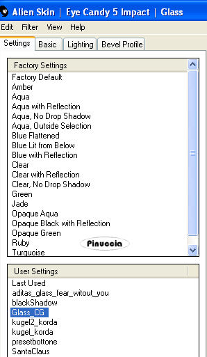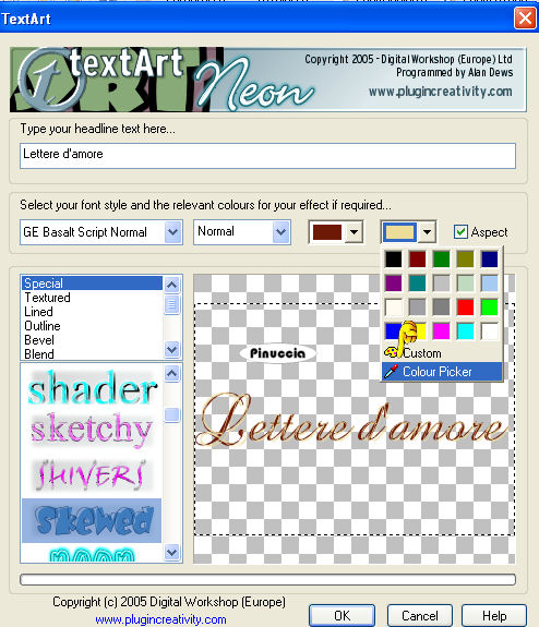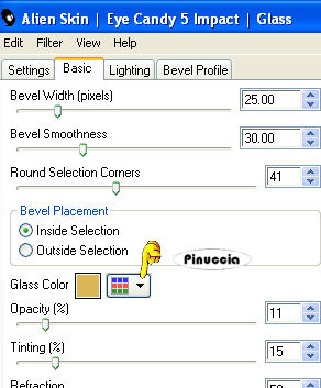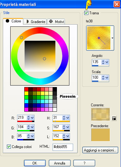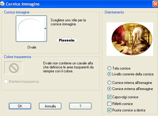 qui puoi trovare qualche risposta ai tuoi dubbi. Se l'argomento che ti interessa non è presente, ti prego di segnalarmelo. Questo tutorial è stato creato con PSP 9, ma può essere eseguito anche con le altre versioni di PSP. Per tradurlo, ho usato PSP X. Questo tutorial è una creazione di ©Christa e non può essere copiato su altri siti nè essere offerto per il download. Lo stesso vale per la mia traduzione. Il materiale viene da vari gruppi di condivisione. Il copyright appartiene ai rispettivi autori. Grazie ai creatori dei tubes che mettono a disposizione il loro lavoro in vari gruppi di condivisione. Occorrente: Materiale qui Grazie Patries, PSP Jet e Lila per i tubes. Rispetta il lavoro degli autori, non cambiare il nome del file e non cancellare il watermark. Filtri: OptikVerve Labs - Virtual Photographer qui Alien Skin Eye Candy 5 Impact - Glass qui Creativity - Text art qui Xero - Bad Dream XL qui Graphics Plus - Cross Shadow qui Xero - Improver qui Filters Unlimited 2.0 qui VM Distortion - Tumbler qui ![]() Metti la selezione nella cartella Selezioni. Metti il preset glass_CG.f1s nella cartella Alien Skin Eye Candy 5 Impact>Settings>Glass. Se preferisci, puoi importare il preset direttamente dalla cartella in cui hai scompattato il materiale. Vedi sull'argomento la scheda relativa al filtro qui Apri il resto del materiale in PSP. 1. Apri una nuova immagine trasparente 720 x 580 pixels. Imposta il colore di primo piano con il colore chiaro #dbb855, e il colore di sfondo con il colore scuro #473213. Riempi l'immagine trasparente con il colore di sfondo.Effetti>Plugins>Graphics Plus - Cross Shadow, con i settaggi standard. ![]() Effetti>Plugins>Filters Unlimited 2.0 - VM Distortion - Tumbler. ![]() 2. Livelli>Nuovo livello raster. Selezione>Seleziona tutto. Apri "Frame(126)" e vai a Modifica>Copia. Torna al tuo lavoro e vai a Modifica>Incolla nella selezione. Selezione>Deseleziona. Cambia la modalità di miscelatura di questo livello in Luce netta. Apri il tube "4022.pspimage" e vai a Modifica>Copia. Torna al tuo lavoro e vai a Modifica>Incolla come nuovo livello. Immagine>Rifletti. Sposta il tube a destra.Effetti>Effetti 3D>Sfalsa ombra, con il colore nero. ![]() Effetti>Plugins>Xero - Bad Dream XL. ![]() 3. Apri il tube "jet-Man-november-2007" e vai a Modifica>copia. Torna al tuo lavoro e vai a Modifica>Incolla come nuovo livello. Livelli>Disponi>Sposta giù. Sposta il tube a sinistra.Cambia la modalità di miscelatura di questo livello in Luce diffusa. Apri il tube "PatryMists_06_Valentine" e vai a Modifica>Copia. Torna al tuo lavoro e vai a Modifica>Incolla come nuovo livello. Spostalo in basso a sinistra.cambia la modalità di miscelatura di questo livello in Luce netta. Livelli>Unisci>Unisci tutto. ![]() 4. Immagine>Cornice-immagine - seleziona la cornice "Ovale", con i seguenti settaggi. questa cornice è standard in PSP 9: se stai usando versioni successive prendi la cornice qui ![]() Seleziona il bordo bianco con la bacchetta magica ![]() Imposta il colore di primo piano selezionando la trama te38 con i seguenti settaggi. trovi la trama, da mettere nella cartella Trame, nella cartella insieme alla cornice ovale ![]() Riempi la selezione con questo colore+trama.Modifica>Incolla come nuovo livello (il tube di Patries è ancora in memoria). Sposta il tube nell'angolo in alto a sinistra.Selezione>Inverti. Premi sulla tastiera il tasto CANC. Selezione>Deseleziona. Cambia la modalità di miscelatura di questo livello in Luce diffusa. Livelli>Duplica. Immagine>Capovolgi. Attiva il livello della cornice. Livelli>Nuovo livello raster. Selezione>Carica/Salva selezione>Carica selezione da disco. Cerca e carica la selezione oval_tub694_cg. ![]() Effetti>Plugins>Alien Skin Eye Candy 5 Impact - Glass, seleziona il preset Glass_CG, e imposta il colore di primo piano sotto Basic. ![]() Selezione>Deseleziona. 5. Livelli>Nuovo livello raster. Effetti>Plugins>Creativity - TextArt e scrivi un testo con colori abbinati al tuo lavoro. ![]() Poichè il testo sarà troppo grande, vai a Immagine>Ridimensiona, al 70%, tutti i livelli non selezionato. Immagine>Ruota per gradi - 90 gradi a sinistra. ![]() Sposta il testo a sinistra.Aggiungi il tuo nome e/o il tuo watermark su un nuovo livello. Livelli>Unisci>Unisci tutto. 6. Immagine>Aggiungi bordatura, 3 pixels, simmetriche, con il colore di sfondo. Immagine>Aggiungi bordatura, 10 pixels, simmetriche, con il colore di primo piano. Seleziona questo bordo con la bacchetta magica ![]() Effetti>Plugins>Graphics Plus - Cross Shadow, con i settaggi standard. ![]() Selezione>Deseleziona. Immagine>Aggiungi bordatura, 3 pixels, simmetriche, con il colore di sfondo. Effetti>Plugins>OptikVerve Labs - Virtual Photographer. ![]() Hai finito. Salva il tuo lavoro in formato jpg. ![]() Se hai problemi o dubbi, o trovi un link non funzionante, o anche soltanto per un saluto, scrivimi. 17 Gennaio 2010 |
