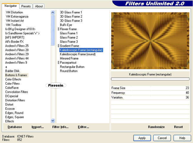 Effetti>Plugins>Filters Unlimited 2.0 - Buttons and Frames - Kaleidoscopic Frame (rectangular).