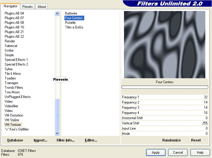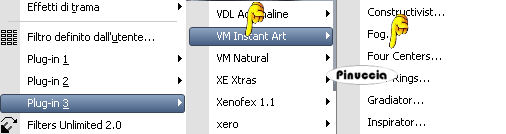 attenzione: importando il filtro Four Centers dalla cartella VM Instant Art in Filters Unlimited, lo troverai poi inserito nella cartella VM Texture. Se invece, vuoi usare il filtro senza importarlo in Unlimited, lo troverai nella sua cartella originaria.