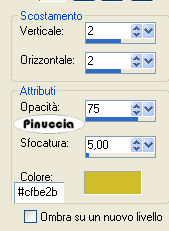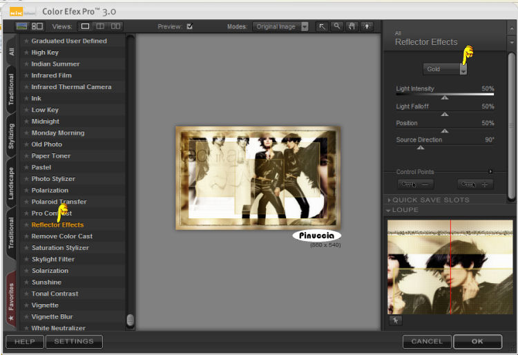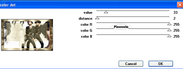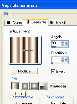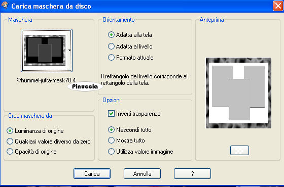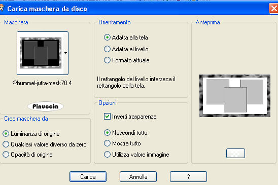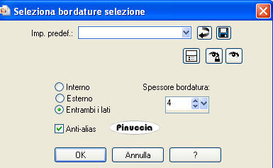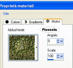 qui puoi trovare qualche risposta ai tuoi dubbi. Se l'argomento che ti interessa non è presente, ti prego di segnalarmelo. Questo tutorial è stato creato con PSP 9, ma può essere eseguito anche con le altre versioni di PSP. Per tradurlo, ho usato PSP X. Questo tutorial è una creazione di ©Christa e non può essere copiato su altri siti nè essere offerto per il download. Lo stesso vale per la mia traduzione. Il materiale viene da vari gruppi di condivisione. Il copyright appartiene ai rispettivi autori. Grazie ai creatori dei tubes che mettono a disposizione il loro lavoro in vari gruppi di condivisione. Occorrente: Materiale qui Grazie Jutta per la maschera. Il manifesto utilizzato è stato trovato nel sito http://www.wallpaper-area.to/ Wallpaper Rispetta il lavoro degli autori, non cambiare il nome del file e non cancellare il watermark. Filtri: Penta.com - color Dot qui Xero - Porcelain qui Nik Software Color Efex Pro 3.0 qui ![]() Metti il gradiente antiquesilver2 nella cartella Gradienti. Metti il motivo fdoluzVerde nella cartella Motivi. 1. Apri una nuova immagine trasparente 900 x 545 pixels. Imposta il colore di primo piano con il gradiente antiquesilver2: ![]() Imposta il colore di sfondo con #3f2f12. Riempi l'immagine trasparente con il gradiente (o con il colore che preferisci).2. Apri l'immagine "FE_1024x768_brune.jpg". Attiva lo strumento Selezione , rettangolo,e seleziona l'immagine senza il bordo nero. ![]() Modifica>Copia. Torna al tuo lavoro. Selezione>Seleziona tutto. Livelli>Nuovo livello raster. Modifica>Incolla nella selezione. Selezione>Deseleziona. Apri l'immagine rielaborata dall'autrice del tutorial - Bild1.pspimage - e vai a Modifica>Copia. Torna al tuo lavoro e vai a Modifica>Incolla come nuovo livello. Attenzione, se vuoi usare una tua immagine, sulla scelta orientati su quella del tutorial, che è stata ricavata da un manifesto (wallpaper). Prima ridimensiona l'immagine - Immagine>Ridimensiona - 575 x 619 pixels. Poi applica la maschera: Livelli>Carica/Salva maschera>Carica maschera da disco. Cerca e carica la maschera ©hummel-jutta_mask704, con i seguenti settaggi: ![]() Livelli>Unisci>Unisci gruppo. Per illustrare l'esempio ecco il risultato da un altro wallpaper: ![]() Tornando all'immagine che hai appena incollato sul tuo lavoro: Immagine>Ridimensiona, al 75%, tutti i livelli non selezionato. Sposta l'immagine a sinistra (vedi il mio esempio).Regola>Messa a fuoco>Metti a fuoco. Livelli>Unisci>Unisci giù. 3. Livelli>Carica/Salva maschera>Carica maschera da disco. Cerca e carica la maschera ©hummerl-jutta-mask70.4: ![]() Livelli>Unisci>Unisci gruppo. Effetti>Effetti 3D>Sfalsa ombra, con il colore #cfbe2b. ![]() Livelli>Unisci>Unisci tutto. Effetti>Plugins>Penta.com - Color dot: ![]() Effetti>Plugins>Xero - Porcelain XL: ![]() 4. Immagine>Aggiungi bordatura, 2 pixels, simmetriche, con il colore a6895f. Modifica>Copia. Immagine>Aggiungi bordatura, 30 pixels, simmetriche, con il colore bianco. Seleziona questo bordo con la bacchetta magica ![]() Livelli>Nuovo livello raster. Modifica>Incolla nella selezione. Regola>Sfocatura>Sfocatura gaussiana - raggio 15. ![]() Effetti>Plugins>Penta.com - Color Dot, con i settaggi precedenti. Attiva il livello di sfondo. Selezione>Inverti. Effetti>Effetti 3D>Sfalsa ombra, con il colore nero. ![]() Ripeti l'Effetto Sfalsa ombra, cambiando verticale e orizzontale con -2. Selezione>Modifica>Seleziona bordature selezione: ![]() Livelli>Nuovo livello raster. Livelli>Disponi>Porta in alto. Passa il colore di primo piano a Motivi e seleziona il motivo fdoluzVerde con i seguenti settaggi. ![]() Riempi la selezione con questo motivo.Cambia la modalità di miscelatura di questo livello in Dissolvi, e abbassa l'opacità al 22%. ![]() Selezione>Deseleziona. Livelli>Unisci>Unisci tutto. Immagine>Ridimensiona - senza mettere a fuoco - a 860 pixels di larghezza. ![]() 5. Effetti>Plugins>Nik Software - Color Efex Pro 3.0, seleziona Reflector Effects - Gold: ![]() ![]() Apri il file con il testo (o, se preferisci, usa un tuo testo) e vai a Modifica>Copia. Torna al tuo lavoro e vai a Modifica>Incolla come nuovo livello. Posiziona correttamente il testo.Aggiungi il tuo nome e/o il tuo watermark su un nuovo livello. Livelli>Unisci>Unisci tutto e salva in formato jpg. Se hai problemi o dubbi, o trovi un link non funzionante, o anche soltanto per un saluto, scrivimi. 9 Settembre 2009 |