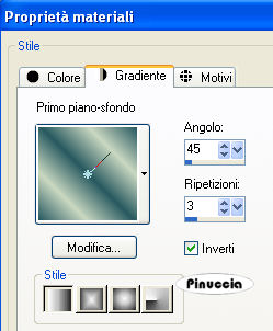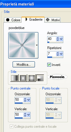 Passa il colore di primo piano a Gradiente, e seleziona il gradiente powderblue, con i seguenti settaggi.