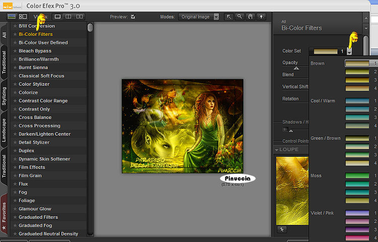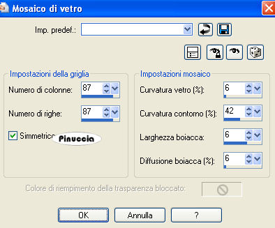 qui puoi trovare qualche risposta ai tuoi dubbi. Se l'argomento che ti interessa non è presente, ti prego di segnalarmelo. Questo tutorial è stato creato con PSP 9, ma può essere eseguito anche con le altre versioni di PSP. Per tradurlo, ho usato PSP X. Questo tutorial è una creazione di ©Christa e non può essere copiato su altri siti nè essere offerto per il download. Lo stesso vale per la mia traduzione. Il materiale viene da vari gruppi di condivisione. Il copyright appartiene ai rispettivi autori. Grazie ai creatori dei tubes che mettono a disposizione il loro lavoro in vari gruppi di condivisione. Occorrente: Materiale qui Rispetta il lavoro degli autori, non cambiare il nome del file e non cancellare il watermark. Filtri: Flaming Pear - Flood qui FM Tile Tools - Blend Emboss qui Graphics Plus - Cross Shadow qui Nik Software - Color Efex Pro 3.0 qui ![]() Metti il gradiente nella cartella Gradienti. Apri il resto del materiale in PSP. 1. Apri una nuova immagine trasparente 860 x 680 pixels. Passa il colore di primo piano a Gradiente e seleziona il gradiente daisyfae, con i seguenti settaggi: attenzione, il nome del gradiente inizia con un segno che, per effetto dell'ordine alfabetico, lo porterà in cima alla lista e non alla lettera "d" ![]() Imposta il colore di sfondo con #0f2a05. Riempi l'immagine trasparente con il gradiente.Effetti>Effetti di immagine>Motivo unico: ![]() Effetti>Plugins>Graphics Plus - Cross Shadow: ![]() 2. Effetti>Effetti di trama>Mosaico di vetro. ![]() Effetti>Plugins>Flaming Pear - Flood: ![]() Effetti>Plugins>FM Tile Tools - Blend Emboss, con i settaggi standard. ![]() 3. Apri il tube "Tube_098.pspimage " e vai a Modifica>Copia. Torna al tuo lavoro e vai a Modifica>Incolla come nuovo livello. Posiziona il tube in alto a destra.Cambia la modalità di miscelatura di questo livello in Luminanza (esistente). Livelli>Duplica. Immagine>Rifletti. Livelli>Unisci>Unisci giù. Effetti>Plugins>FM Tile Tools - Blend Emboss, con i settaggi standard. 4. Apri "Sept Series Autumn 2-2.pspimage" e vai a Modifica>Copia. Torna al tuo lavoro e vai a Modifica>Incolla come nuovo livello. Sposta il tube nell'angolo in alto a destra.Livelli>Duplica. Immagine>Rifletti. Livelli>unisci>Unisci giù. Effetti>Plugins>FM Tile Tools - Blend Emboss, con i settaggi standard. Apri "aclis_fantasy_20_09.pspimage" e vai a Modifica>Copia. Torna al tuo lavoro e vai a Modifica>Incolla come nuovo livello. Sposta il tube in alto a sinistra contro il bordo.Cambia la modalità di miscelatura di questo livello in Luce netta. Effetti>Plugins>FM Tile Tools - Blend Emboss, con i settaggi standard. Apri "demo(46).pspimage" e vai a Modifica>Copia. Torna al tuo lavoro e vai a Modifica>Incolla come nuovo livello. Sposta il tube in basso a sinistra.Effetti>Plugins>FM Tile Tools - Blend Emboss, con i settaggi standard. Cambia la modalità di miscelatura di questo livello in Luminanza (esistente). 5. Apri "Strange_autumn_by_Estele.pspimage" e vai a Modifica>Copia. Torna al tuo lavoro e vai a Modifica>Incolla come nuovo livello. Immagine>Ridimensiona, all'80%, tutti i livelli non selezionato. Sposta il tube in basso a destra.Regola>Messa a fuoco>Metti a fuoco. ![]() Effetti>Effetti 3D>Sfalsa ombra, con i seguenti settaggi, colore nero. ![]() Ripeti l'Effetto Sfalsa ombra, cambiando verticale e orizzontale con 2. Livelli>Unisci>Unisci tutto. Immagine>Ridimensiona, a 750 pixels di larghezza (non mettere a fuoco...). ![]() Immagine>Aggiungi bordatura, 2 pixels, simmetriche, con il colore nero. Modifica>Copia. Immagine>Aggiungi bordatura, con il colore di sfondo, simmetriche non selezionato: ![]() Seleziona il bordo con la bacchetta magica ![]() Livelli>Nuovo livello raster. Modifica>Incolla nella selezione. Effetti>Effetti di trama>Mosaico di vetro, con i settaggi precedenti. Selezione>Seleziona tutto. 6. Livelli>Nuovo livello raster. Apri "Frame(1979).png e vai a Modifica>Copia. Torna al tuo lavoro e vai a Modifica>Incolla nella selezione. Cambia la modalità di miscelatura di questo livello in Moltiplica. Effetti>Plugins>FM Tile Tools - Blend Emboss, con i settaggi standard. Selezione>Deseleziona. Livelli>Unisci>Unisci tutto. Immagine>Aggiungi bordatura, 2 pixels, simmetriche, con il colore di sfondo. Apri il file con il testo (o, se preferisci, usa un tuo testo) e vai a Modifica>Copia. Torna al tuo lavoro e vai a Modifica>incolla come nuovo livello. Posiziona il testo correttamente.Aggiungi il tuo nome e/o il tuo watermark su un nuovo livello. Per il mio testo ho usato il font Cracked Johnnie, dimensione 30. Livelli>Unisci>Unisci tutto. Effetti>Plugins>Nik Software - Color Efex Pro 3.0: nella colonna a sinistra, seleziona Bi-Color Filters, e nella colonna a destra imposta Color-set con Brown 1: ![]() con i seguenti settaggi: ![]() Hai finito.Puoi salvare in formato jpg. ![]() Se hai problemi o dubbi, o trovi un link non funzionante, o anche soltanto per un saluto, scrivimi. 7 Settembre 2009 |