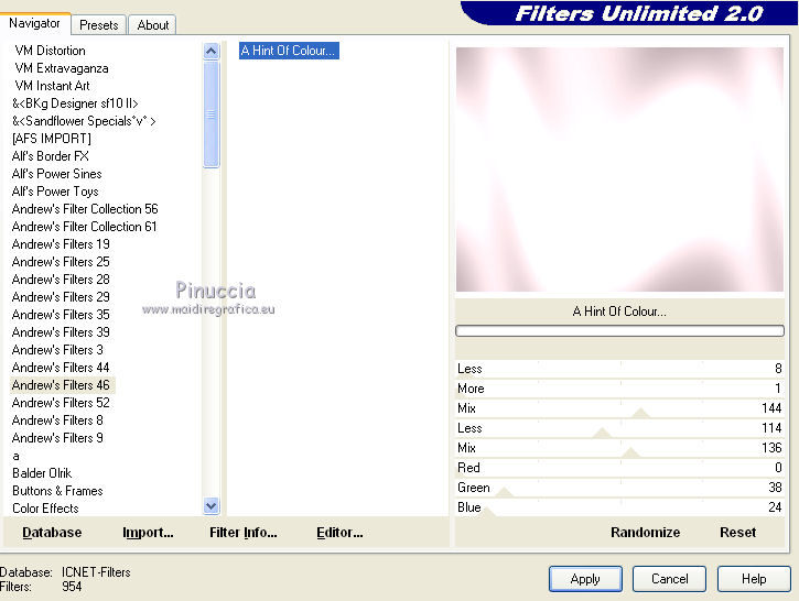 Effetti>Plugins>Filters Unlimited 2.0 - Andrew's Filters 46 - A Hint of Colour: