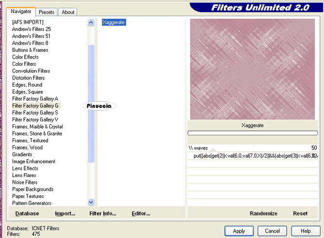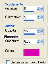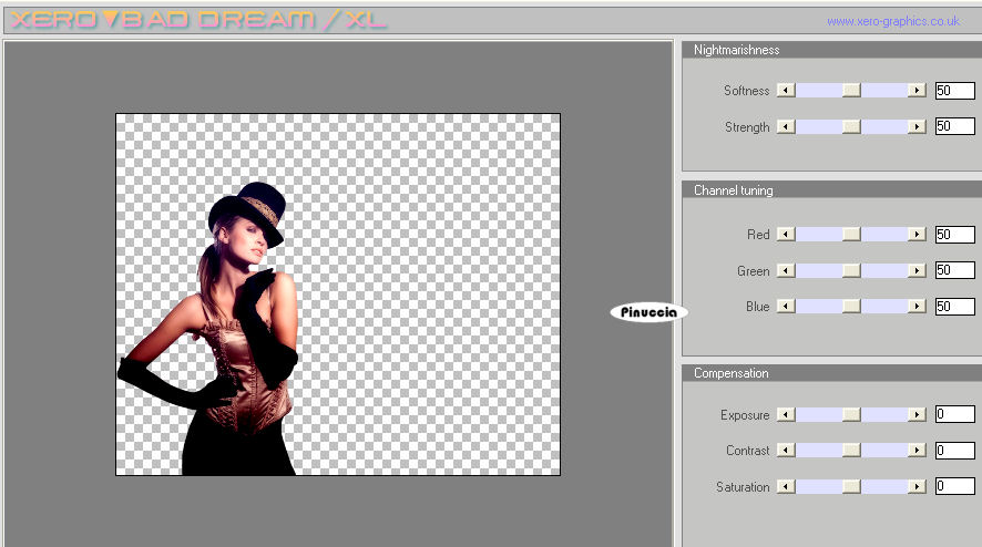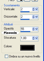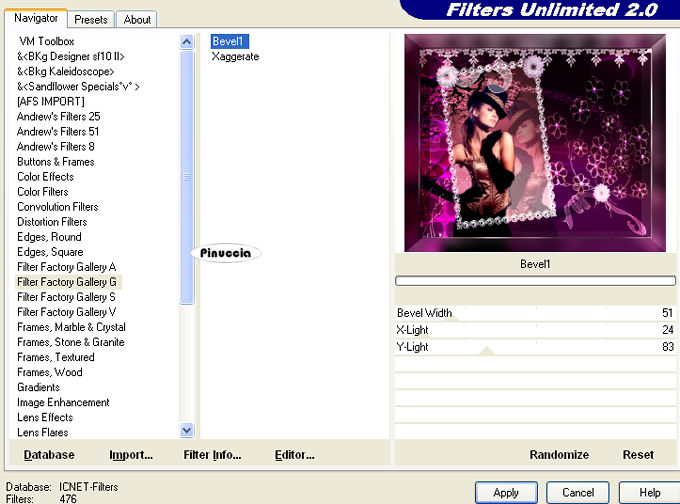 qui puoi trovare qualche risposta ai tuoi dubbi. Se l'argomento che ti interessa non è presente, ti prego di segnalarmelo. Questo tutorial è stato creato con PSP 9, ma può essere eseguito anche con le altre versioni di PSP. Per tradurlo, ho usato PSP X. Questo tutorial è una creazione di ©Christa e non può essere copiato su altri siti nè essere offerto per il download. Lo stesso vale per la mia traduzione. Il materiale viene da vari gruppi di condivisione. Il copyright appartiene ai rispettivi autori. Grazie ai creatori dei tubes che mettono a disposizione il loro lavoro in vari gruppi di condivisione. Occorrente: Materiale qui Peri tube grazie Devilinside e PSP designers Club Rispetta il lavoro degli autori, non cambiare il nome del file e non cancellare il watermark. Filtri: Alien skin Xenofex 2.0 - Constellation qui Xero - Porcelain XL qui Xero - Improver qui Graphics Plus - Cross Shadow qui Filters Unlimited qui Filter Factory Gallery G - Xaggerate e Bevel 1 qui I filtri Factory Gallery per essere usati devono prima essere convertiti. Come fare vedi qui Si usano importandoli in Filters Unlimited (come fare vedi qui) ma possono funzionare anche da soli ![]() Metti il gradiente Winni.Designs-gr.purple 1b nella cartella Gradienti e apri il resto del materiale in PSP. 1. Apri una nuova immagine trasparente 800 x 650 pixels. Passa il colore di primo piano a Gradiente, seleziona il gradiente Winni.Designs.gr.purple 1b, con i seguenti settaggi. ![]() Imposta il colore di sfondo con #350429. Riempi l'immagine trasparente con il gradiente.Regola>Sfocatura>Sfocatura gaussiana - raggio 25. ![]() Effetti>Effetti di bordo>Aumenta, con i settaggi standard. ![]() Effetti>Plugins>Filters Unlimited 2.0 - Filter Factory Gallery A - Xaggerate: ![]() Qui, se stai usando altri colori, dovrai colorizzare l'immagine (non se stai usando i colori del tutorial). sull'uso del Viraggio, vedi qui 2. Livelli>Nuovo livello raster. Selezione>Seleziona tutto. Apri "sd_endless_bk1.jpg" e vai a Modifica>copia. Torna al tuo lavoro e vai a Modifica>Incolla nella selezione. Selezione>Deseleziona. Cambia la modalità di miscelatura di questo livello in Luce netta. Apri "PspDesigners Club 165.pspimage" e vai a Modifica>Copia. Torna al tuo lavoro e vai a Modifica>Incolla come nuovo livello. Sposta il tube a sinistra.Effetti>Plugins>Xero - Bad Dream XL: ![]() ricorda che per usare la versione XL, devi rimuovere la precedente versione dalle Preferenze files Livelli>Duplica. Immagine>Rifletti. Sposta questo tube un po' più in basso, accanto all'originale.![]() Livelli>Disponi>Sposta giù. Abbassa l'opacità di questo livello al 38%. Attiva il livello originale del tube. Effetti>Effetti 3D>sfalsa ombra, con il colore nero. ![]() Ripeti l'Effetto Sfalsa ombra, cambiando verticale e orizzontale con -2. 3. Attiva il livello Raster 1. Selezione>seleziona tutto. Livelli>Nuovo livello raster. Livelli>Disponi>Porta in alto. Apri "Frame(197).png" e vai a Modifica>Copia. Torna al tuo lavoro e vai a Modifica>Incolla nella selezione. Selezione>Deseleziona. Cambia la modalità di miscelatura di questo livello in Luce netta. Ricorda di colorizzare se stai usando altri colori. Attiva il livello Raster 1. Livelli>Unisci>Unisci tutto. Immagine>Ridimensiona, a 680 pixels di larghezza (l'altezza si ridurrà proporzionalmente). Regola>Messa a fuoco>Metti a fuoco. Immagine>Aggiungi bordatura, 1 pixel, simmetriche, con il colore di sfondo. Modifica>Copia. 4. Immagine>Aggiungi bordatura, 3 pixels, simmetriche, con il colore bianco. Seleziona questo bordo con la bacchetta magica ![]() Riempi la selezione con il gradiente.Effetti>Plugins>Graphics Plus - Cross Shadow, con i settaggi standard. ![]() Selezione>Deseleziona. Immagine>Aggiungi bordatura, 1 pixel, simmetriche, con il colore di sfondo. Immagine>Aggiungi bordatura, 40 pixels, simmetriche, con il colore bianco. Seleziona questo bordo con la bacchetta magica ![]() Modifica>Incolla nella selezione. Regola>Sfocatura>sfocatura gaussiana - raggio 15. ![]() Effetti>Plugins>Filters Unlimited - Filter Factory Gallery G - Bevel 1. ![]() Regola>Aggiungi/Rimuovi disturbo>Aggiungi disturbo. ![]() Selezione>Inverti. Effetti>Effetti 3D>Sfalsa ombra, con il colore chiaro #d700aa. ![]() Ripeti l'Effetto Sfalsa ombra, cambiando verticale e orizzontale con -5. Selezione>Deseleziona. 5. Apri "Devilsinside_Exclusiv_75_2009.pspimage" e vai a Modifica>Copia. Torna al tuo lavoro e vai a Modifica>Incolla come nuovo livello. Immagine>Ridimensiona, al 55%, tutti i livelli non selezionato. Sposta il tube a destra.Effetti>Effetti 3D>sfalsa ombra, con il colore nero. ![]() Ripeti l'Effetto Sfalsa ombra, cambiando verticale e orizzontale con -2. Effetti>Plugins>Xero - Bad Dream, con i settaggi precedenti. Effetti>Plugins>Xero - Improver: ![]() Apri il file con il testo o, se preferisci, usa un tuo testo, e vai a Modifica>Copia. Torna al tuo lavoro e vai a Modifica>Incolla come nuovo livello. Posiziona correttamente il testo.Aggiungi il tuo nome e/o il tuo watermark su un nuovo livello. Apri "cornerrand.pspimage" e vai a Modifica>Copia. Torna al tuo lavoro e vai a Modifica>Incolla come nuovo livello. Se stai usando altri colori, colorizza. Livelli>Unisci>Unisci tutto. Immagine>Aggiungi bordatura, 1 pixel, simmetriche, con il colore di sfondo. Immagine>Aggiungi bordatura, 3 pixels, simmetriche, con il colore bianco. Seleziona questo bordo con la bacchetta magica ![]() Riempi la selezione con il gradiente.Effetti>Plugins>Graphics Plus - Cross Shadow, con i settaggi standard. ![]() Selezione>Deseleziona. Salva in formato jpg. Se hai problemi o dubbi, o trovi un link non funzionante, o anche soltanto per un saluto, scrivimi. 20 Settembre 2009 |