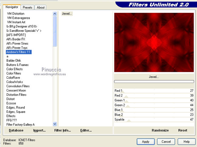 Effetti>Plugins>Filters Unlimited 2.0 - Andrew's Filter 11 - Jewel, con i settaggi standard.