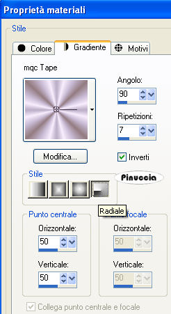 Passa il colore di primo piano a Gradiente, seleziona il gradiente mqc Tape, con i seguenti settaggi.