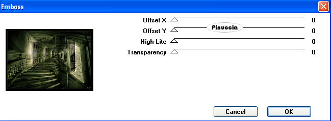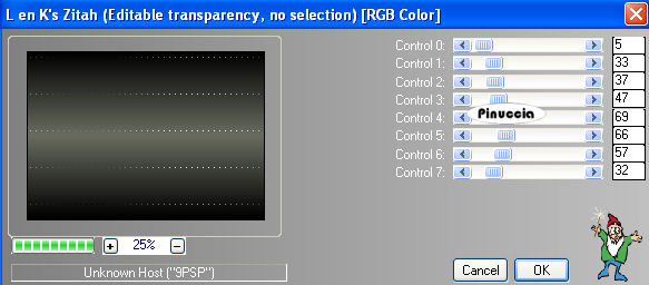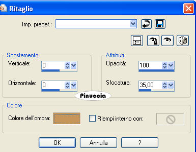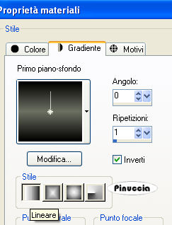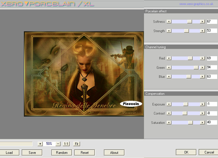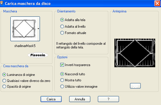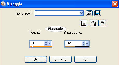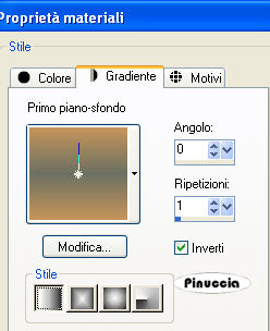 qui puoi trovare qualche risposta ai tuoi dubbi. Se l'argomento che ti interessa non è presente, ti prego di segnalarmelo. Questo tutorial è stato creato con PSP 9, ma può essere eseguito anche con le altre versioni di PSP. Per tradurlo, ho usato PSP X. Questo tutorial è una creazione di ©Christa e non può essere copiato su altri siti nè essere offerto per il download. Lo stesso vale per la mia traduzione. Il materiale viene da vari gruppi di condivisione. Il copyright appartiene ai rispettivi autori. Grazie ai creatori dei tubes che mettono a disposizione il loro lavoro in vari gruppi di condivisione. Occorrente: Materiale qui Grazie Margit per i tubes. Il tube della donna a destra nel tutorial originale non è incluso nel materiale. Per il mio esempio ho usato un tube di MDZ Mist. Le maschere sono di Yvonne e Sharlimar. Rispetta il lavoro degli autori, non cambiare il nome del file e non cancellare il watermark. Filtri: Graphics Plus qui Xero Porcelain XL qui L&K Zitah - qui ![]() Metti le maschere nella cartella Maschere e apri il resto del materiale in PSP. 1. Apri una nuova immagine trasparente 850 x 600 pixels. Imposta il colore di primo piano con #6c7062, e il colore di sfondo con il nero. Passa il colore di primo piano a Gradiente: ![]() Riempi l'immagine trasparente con il gradiente.Effetti>Plugins>L&K - Zitah: ![]() 2. Livelli>Nuovo livello raster. Cambia il colore di sfondo con #c5955a; in questo modo automaticamente cambierà anche il gradiente: ![]() Riempi il livello con questo gradiente.Livelli>Carica/Salva maschera>Carica maschera da disco. Cerca e carica la maschera mask-YvonneS-28: ![]() Livelli>Unisci>Unisci gruppo. 3. Apri "fantasie.pspimage" e vai a Modifica>copia. Torna al tuo lavoro e vai a Modifica>Incolla come nuovo livello. Effetti>Plugins>Graphics Plus - Emboss. ![]() Mantieni l'opacità del livello al 42%. Apri il tube "MMDesignz_Cr102149.pspimage" e vai a Modifica>copia. Torna al tuo lavoro e vai a Modifica>Incolla come nuovo livello. Spostalo in alto a sinistra contro il bordo.Cambia la modalità di miscelatura di questo livello in Luce diffusa, e abbassa l'opacità al 92%. 4. Apri il tube che inserire a destra dell'immagine che non è nel materiale. Modifica>copia. Torna al tuo lavoro e vai a Modifica>Incolla come nuovo livello. Regola>Tonalità e Saturazione>Viraggio: ![]() Cambia la modalità di miscelatura di questo livello in Luce netta, e abbassa l'opacità al 70%. Apri "MMDesignz_Cr106149.pspimage" e vai a Modifica>copia. Torna al tuo lavoro e vai a Modifica>Incolla come nuovo livello. Spostalo in basso a sinistra, sul bordo.Regola>Tonalità e Saturazione>Viraggio, con i settaggi precedenti. Cambia la modalità di miscelatura di questo livello in Luce netta, e abbassa l'opacità al 36%. Apri "Giada_queen_of_fire.pspimage" e vai a Modifica>copia. Torna al tuo lavoro e vai a Modifica>Incolla come nuovo livello. Posiziona questo tube al centro.Qui puoi unire i livelli o puoi lasciarli aperti. In questo caso, potrai sempre spostarli, se necessario, dopo il caricamento della prossima maschera. 5. Livelli>Nuovo livello raster. Riempi il livello con l'ultimo gradiente.Livelli>Carica/Salva maschera>Carica maschera da disco. Cerca e carica la maschera sharlimarMask5: ![]() Livelli>Unisci>Unisci gruppo. Adesso, se hai lasciato i livelli aperti, puoi ancora spostare i tube per sistemarli meglio. Livelli>Unisci>Unisci visibile. Selezione>Seleziona tutto. Livelli>Nuovo livello raster. Riempi con il colore di primo piano.Selezione>Modifica>Contrai - 2 pixels. Riempi con il colore di sfondo.Selezione>Modifica>Contrai - 2 pixels. Riempi con il colore di primo piano.Selezione>Modifica>Contrai - 2 pixels. Premi sulla tastiera il tasto CANC. Selezione>Inverti. Effetti>Plugins>Graphics Plus - Cross Shadow, con i settaggi standard. ![]() Selezione>Inverti. Effetti>Effetti 3D>Ritaglio, con il colore di sfondo. ![]() Selezione>Deseleziona. Attiva lo strumento Testo , scegli un font, o usa quello fornito, e scrivi un testo sull'immagine.Per il mio esempio ho usato il font Madisonian, dimensione 48 (se stai usando PSP 9, dimensione 36). Effetti>Effetti 3D>sfalsa ombra, con il colore nero. ![]() Effetti>Effetti 3D>Smusso a incasso: ![]() Aggiungi il tuo nome e/o il tuo watermark su un nuovo livello. Livelli>Unisci>Unisci tutto. Effetti>Plugins>Xero - Porcelain XL - 2 volte. ![]() ricorda che la versione XL non funziona se non si rimuove dalle Preferenze file la versione precedente Salva in formato jpg. Se hai problemi o dubbi, o trovi un link non funzionante, o anche soltanto per un saluto, scrivimi. 22 Settembre 2009 |
