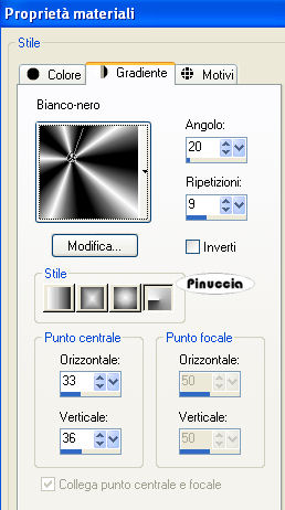 Passa il colore di primo piano a Gradiente e seleziona il gradiente bianco-nero (standard in PSP) con i seguenti settaggi.
