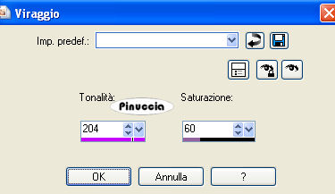 Regola>Tonalità e saturazione>Viraggio, con i settaggi precedenti.