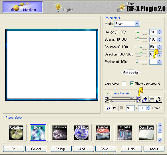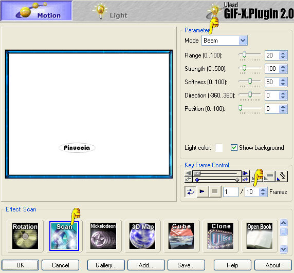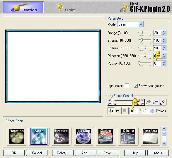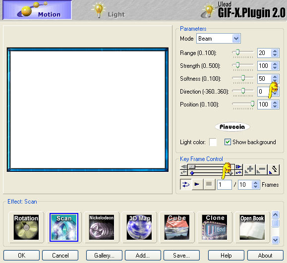 Imposta l'Effetto "Scan" (in basso), Mode "Beam" e riduci i fotogrammi a 10.