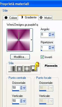 Passa il colore di primo piano a Gradiente e seleziona il gradiente Winni.Designs.gr.purple1q con i seguenti settaggi,