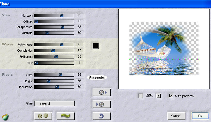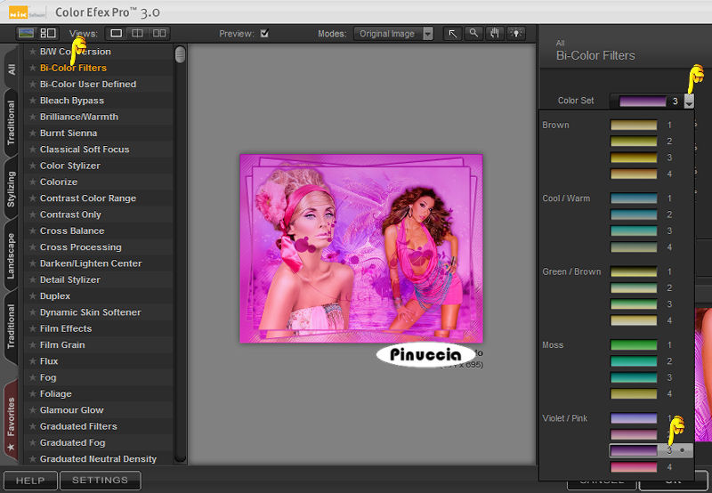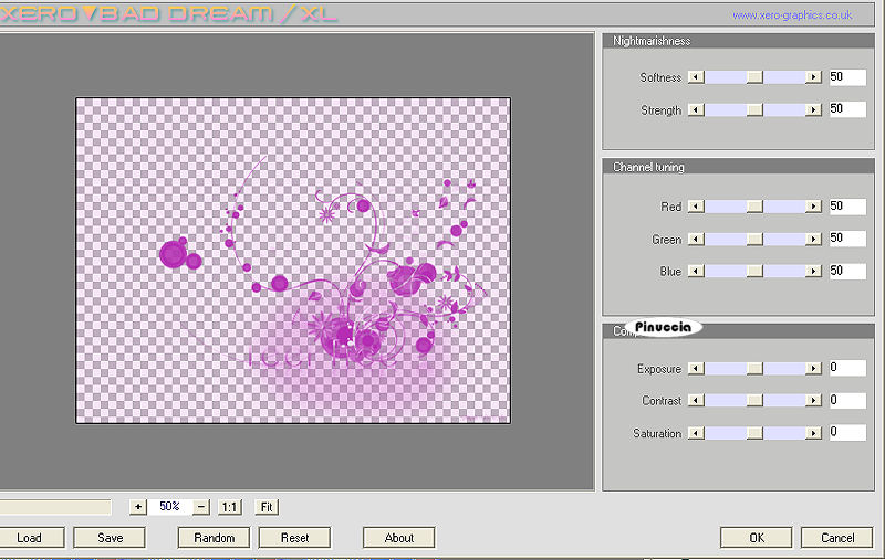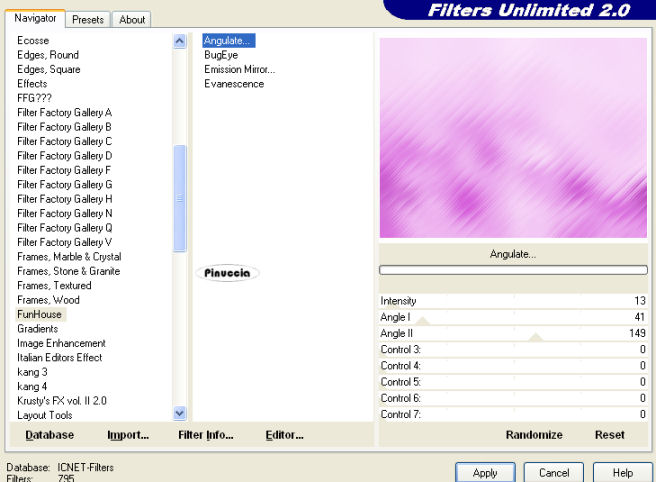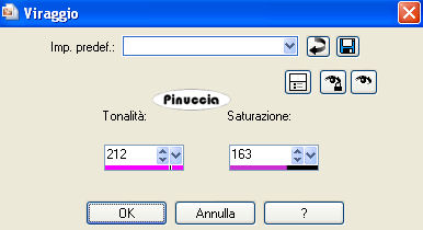 Apri tutto il materiale in PSP. 1. Apri una nuova immagine trasparente 870 x 653 pixels. Colore di primo piano chiuso. Imposta il colore di sfondo con #ac4aab. Selezione>Seleziona tutto. Apri l'immagine con i fiori "wchh_068-1231db1" (o una tua immagine) e vai a Modifica>Copia. Torna all'immagine trasparente e vai a Modifica>Incolla nella selezione. Selezione>Deseleziona. Regola>Tonalità e Saturazione>Viraggio: ![]() Livelli>Duplica. Regola>Sfocatura>Sfocatura gaussiana - raggio 25. ![]() Cambia la modalità di miscelatura di questo livello in Moltiplica. Effetti>Plugins>Filters Unlimited - Funhouse - Angulate: ![]() Effetti>Effetti di bordo>Aumenta. 2. Apri il tube con le palme "Devilinside_349_2009" (o quello che hai scelto) e vai a Modifica>Copia. Torna al tuo lavoro e vai a Modifica>Incolla come nuovo livello. Sposta il tube come nel mio esempio.![]() Cambia la modalità di miscelatura di questo livello in Sovrapponi. Effetti>Plugins>Flaming Pear - Flood. ![]() Attiva lo strumento Deformazione o premi il tasto D sulla tastiera,e "tira" il tube fino al bordo. ![]() Effetti>Effetti di bordo>Aumenta. 3. Apri i due tubes che hai deciso di usare (nel mio esempio i due tubes di Devilinside "Devilinside-217-2009" e "Devilinside Exclusive 26 2009"). Questo passaggio è lo stesso per entrambi i tubes. Modifica>Copia. Torna al tuo lavoro e vai a Modifica>Incolla come nuovo livello. Immagine>Ridimensiona, al 70%, tutti i livelli non selezionato. Regola>Messa a fuoco>Metti a fuoco. Effetti>Effetti 3D>Sfalsa ombra, con il colore di sfondo. ![]() Ripeti l'Effetto Sfalsa ombra, con i seguenti settaggi. ![]() 4. Livelli>Nuovo livello raster. Riempi il livello con il colore di sfondo.Livelli>Nuovo livello maschera>Da immagine. Apri il menu sotto la finestra di origine e vedrai la lista dei files aperti. Seleziona think_positiv_Part1_by_crazy: ![]() Livelli>Unisci>Unisci gruppo. Effetti>Plugins>FM Tile Tools - Blend Emboss, con i settaggi standard. ![]() Effetti>Plugins>Xero - Bad Dream XL ![]() la versione XL non funziona se non viene rimossa dalle preferenze files la versione precedente. Cambia la modalità di miscelatura di questo livello in Moltiplica. Livelli>unisci>Unisci tutto. 5. Immagine>Aggiungi bordatura, 2 pixels, simmetriche, con il colore di sfondo. Modifica>Copia. Immagine>Ridimensiona: ![]() Regola>Messa a fuoco>Metti a fuoco. Immagine>Aggiungi bordatura, 45 pixels, simmetriche, con un colore qualsiasi, purchè non presente nell'immagine. Seleziona questo bordo con la bacchetta magica ![]() Modifica>Incolla nella selezione. Regola>Sfocatura>Sfocatura gaussiana - raggio 15. ![]() Effetti>Plugins>Funhouse - Angulate, con i settaggi precedenti. Effetti>Effetti di bordo>Aumenta. Selezione>inverti. Modifica>Copia. Selezione>Deseleziona. Modifica>Incolla come nuovo livello. Effetti>Effetti 3D>Sfalsa ombra, con il colore di sfondo. ![]() Ripeti l'Effetto Sfalsa ombra, cambiando verticale e orizzontale con -3. Livelli>Duplica - 2 volte. Attiva il livello originale. Immagine>Ruota per gradi - 5 gradi a sinistra. ![]() Attiva il livello della prima copia. Immagine>Ruota per gradi - 5 gradi a destra. ![]() Livelli>Unisci>Unisci tutto. Immagine>Aggiungi bordatura, 2 pixels, simmetriche, con il colore di sfondo. Effetti>Plugins>Nik software - Color Efex Pro 3.0, seleziona Bi-color filters e, nella colonna a destra, scegli un Color set. Il mio Violet/pink 3: ![]() Apri il file con il testo o, se preferisci, usa un tuo testo e vai a Modifica>Copia. Torna al tuo lavoro e vai a Modifica>Incolla come nuovo livello. Posiziona correttamente il testo.Aggiungi il tuo nome e/o il tuo watermark su un nuovo livello. Livelli>Unisci>Unisci tutto e salva in formato jpg. Se hai problemi o dubbi, o trovi un link non funzionante, o anche soltanto per un saluto, scrivimi.