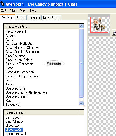 Metti il preset Glass_CG2.f1s nella cartella del filtro: AlienSkin Eye Candy 5 Impact>Settings>Glass. Se preferisci, puoi importarlo direttamente dalla cartella in cui hai scompattato il materiale quanto ti servirà. Vedi gli appunti sull'argomento qui e come importare il preset qui