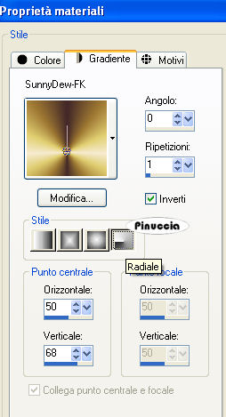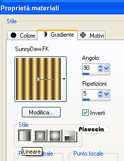 Imposta il colore di primo piano su Gradiente e seleziona il gradiente SunnyDew-FK con i seguenti settaggi.