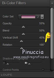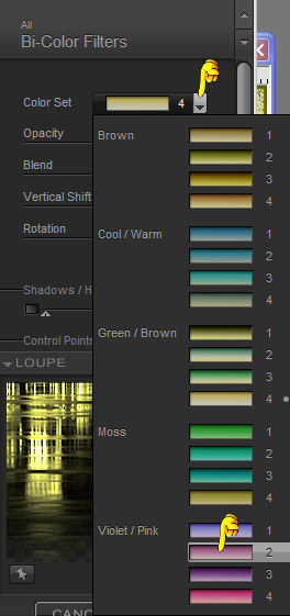 a destra apri il menu Color Set e seleziona Violet/Pink, Rotation a 166°.