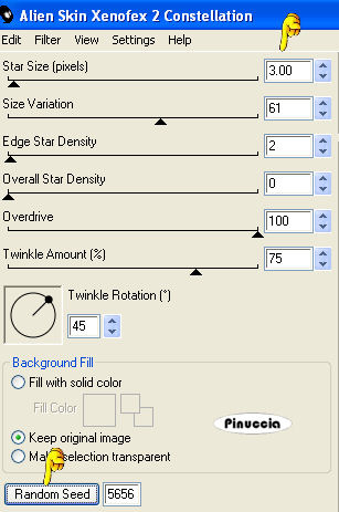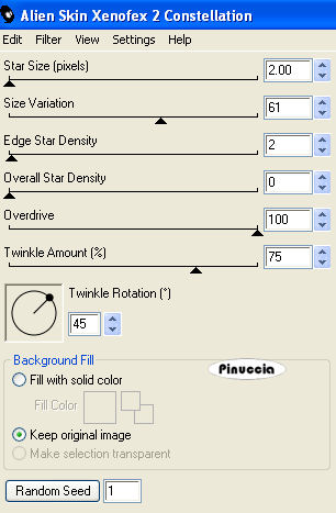 Ripeti l'Effetto Constellation con gli stessi settaggi, cambiando Star Size con 3,00, e premendo Random Seed.