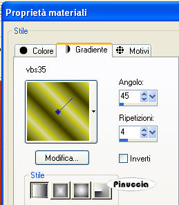 Passa il colore di primo piano a Gradiente e seleziona il gradiente vbs35 con i seguenti settaggi.