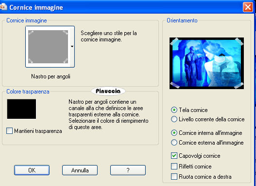 Immagine>Cornice immagine - seleziona la cornice Nastro per angoli (standard in PSP) (oppure se non la trovi seleziona Einfassban) con i seguenti settaggi: