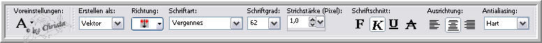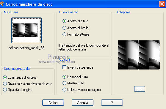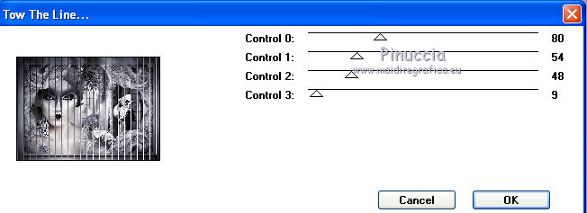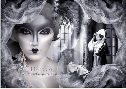 qui puoi trovare qualche risposta ai tuoi dubbi. Se l'argomento che ti interessa non è presente, ti prego di segnalarmelo. Questo tutorial è stato creato con PSP 9, ma può essere eseguito anche con le altre versioni di PSP. Per tradurlo, ho usato PSP X. Questo tutorial è una creazione di ©Christa e non può essere copiato su altri siti nè essere offerto per il download. Lo stesso vale per la mia traduzione. Il materiale viene da vari gruppi di condivisione. Il copyright appartiene ai rispettivi autori. Grazie ai creatori dei tubes che mettono a disposizione il loro lavoro in vari gruppi di condivisione. Occorrente: Materiale qui Per i tubes grazie A PSP Devil . Maschera ©Adita Rispetta il lavoro degli autori, non cambiare il nome del file e non cancellare il watermark. Filtri: in caso di dubbi, ricorda di consultare la mia sezione filtri qui Tramages - Tow the line qui Xero - Improver qui AAA Frames - Foto Frame - qui ![]() Metti la maschera nella cartella Maschere. Apri il resto del materiale in PSP. Apri una nuova immagine nera 860 x 600 pixels. Imposta il colore di primo piano con #9a9aa8, e il colore di sfondo con #c5c3cd. Livelli>Nuovo livello raster. Riempi con il colore chiaro di sfondo.Livelli>Carica/Salva maschera>Carica maschera da disco. Cerca e carica la maschera aditascreations_mask_38: ![]() Livelli>Unisci>Unisci gruppo. 2. Apri il tube "My Spirit" e vai a Modifica>Copia. Torna al tuo lavoro e vai a Modifica>Incolla come nuovo livello. Sposta il tube a destra.Regola>Tonalità e saturazione>Viraggio con i valori corrispondenti al tuo colore di sfondo. I miei: ![]() Apri image_vorlage_cg.pspimage e vai a Modifica>Copia. Torna al tuo lavoro e vai a Modifica>Incolla come nuovo livello. Se stai usando altri, colori, colorizza per adattare l'immagine ai tuoi colori. 3. Apri il tuo tube - il mio k@rine_dreams_Pretty_F_.pspimage. Per il mio tube (se stai usando un altro tube dovrai valutare). Livelli>Carica/Salva maschera>Carica maschera da disco. Cerca e carica la maschera 20-20. Livelli>Unisci>Unisci gruppo. Modifica>Copia. Torna al tuo lavoro e vai a Modifica>Incolla come nuovo livello. Posiziona il tube a sinistra, facendolo combaciare con il velo dello sfondo.![]() Effetti>Plugins>Xero - Improver. ![]() Attiva lo strumento Gomma e cancella le tracce del tube che disturbano il tube a destra.![]() Dovresti avere questo. ![]() Per il tube di sinistra (anche qui dovrai valutare se stai usando un altro tube): Livelli>Duplica e cambia la modalità di miscelatura di questo livello in Luce diffusa. Livelli>Unisci>Unisci tutto. Modifica>Copia. 4,Immagine>Aggiungi bordatura, 1 pixel, simmetriche, con il colore di primo piano. Immagine>Aggiungi bordatura, 45 pixels, simmetriche, con il colore nero. Seleziona questo bordo con la bacchetta magica ![]() Livelli>Nuovo livello raster. Modifica>Incolla nella selezione. Regola>Sfocatura>Sfocatura gaussiana - raggio 15. ![]() Regola>Tonalità e saturazione>Viraggio, con i settaggi precedenti. Selezione>Modifica>Contrai - 3 pixels. Effetti>Plugins>AAA Frames - Foto Frame ![]() Effetti>Plugins>Tramages - Tow the line. ![]() Selezione>Deseleziona. Livelli>Unisci>Unisci tutto. Apri il file di testo e vai a Modifica>Copia. Torna al tuo lavoro e vai a Modifica>Incolla come nuovo livello. Aggiungi il tuo nome e/o il tuo watermark su un nuovo livello. Per questo testo sono stati usati i seguenti settaggi. la schermata sotto è di Christa ![]() Effetti>Effetti 3D>Sfalsa ombra, con il colore nero. ![]() Livelli>Unisci>Unisci tutto. Immagine>Ridimensiona, a 800 pixels di larghezza. Salva in formato jpg. ![]() Se hai problemi o dubbi, o trovi un link non funzionante, o anche soltanto per un saluto, scrivimi. 22 Novembre 2010 |