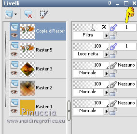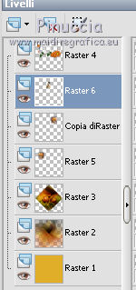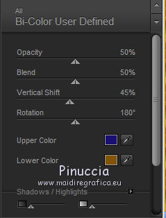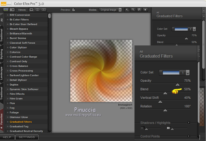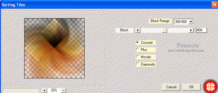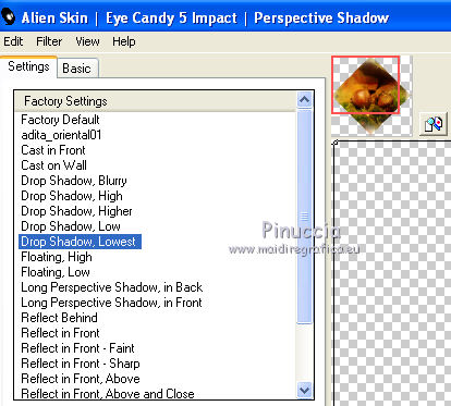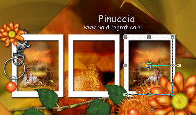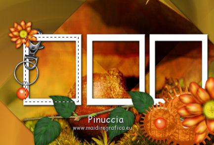 qui puoi trovare qualche risposta ai tuoi dubbi. Se l'argomento che ti interessa non è presente, ti prego di segnalarmelo. Questo tutorial è stato creato con PSP 9, ma può essere eseguito anche con le altre versioni di PSP. Per tradurlo, ho usato PSP X. Questo tutorial è una creazione di ©Christa e non può essere copiato su altri siti nè essere offerto per il download. Lo stesso vale per la mia traduzione. Il materiale viene da vari gruppi di condivisione. Il copyright appartiene ai rispettivi autori. Grazie ai creatori dei tubes che mettono a disposizione il loro lavoro in vari gruppi di condivisione. Occorrente: Materiale qui Per i tubes grazie Corinne.Vicaire, Crealine, Anja La cornice è ©PHF Projekte Rispetta il lavoro degli autori, non cambiare il nome del file e non cancellare il watermark. Filtri: in caso di dubbi, ricorda di consultare la mia sezione filtri qui Xero - Improver qui Nik Software - Color Efex Pro qui Simple - Blintz qui Alien Skin Eye Candy 5 Impact - Perspective Shadow qui Mehdi - Sorting Tiles qui Prima di iniziare anticipo una cosa importante per il tutorial. Le mie descrizioni si riferiscono sempre al modo in cui creo la mia immagine. Per altri tubes e colori, potrebbe essere necessario modificare le mie impostazioni. Gli elementi possono essere colorizzati. Questo non lo scriverò più nel tutorial. ![]() 1. Apri una nuova immagine trasparente 800 x 800 pixels. Imposta il colore di primo piano con #e0ae2a. Riempi l'immagine trasparente con il colore di primo piano.Apri element_strahlen_cg.psd e vai a Modifica>Copia. Torna al tuo lavoro e vai a Modifica>Incolla come nuovo livello. Effetti>Plugins>Nik Software - Color Efex Pro - Graduated Filters: ![]() 2. Effetti>Plugins>Mehdi - Sorting Tiles. ![]() 3. Attiva lo strumento Selezione a mano libera , da punto a punto,e seleziona la forma al centro. ![]() Modifica>Copia. Modifica>Incolla come nuovo livello. Livelli>Nuovo livello raster. Apri il tube "herfst 1 tubed by psp anja" e vai a Modifica>Copia. Torna al tuo lavoro e vai a Modifica>Incolla nella selezione. Cambia la modalità di miscelatura di questo livello in Luce netta. Livelli>Unisci>Unisci giù. Selezione>Deseleziona. Effetti>Plugins>Alien Skin Eye Candy 5 Impact - Perspective Shadow. Seleziona il preset Drop shadow, Lowest e ok. ![]() 3. Apri la cornice PHF_OCluster e vai a Modifica>copia. Torna al tuo lavoro e vai a Modifica>Incolla come nuovo livello. Puoi lasciarla come sta per il momento. La sposterai dopo. Effetti>Plugins>Alien Skin Eye Candy 5 Impact - Perspective Shadow, con i settaggi precedenti. Attiva lo strumento Selezione , rettangolo,e seleziona la cornice a sinistra. ![]() Livelli>Nuovo livello raster. Livelli>Disponi>Sposta giù. Apri il misted "mist corinne.vicaire - paysage 01-31.08.11" e vai a Modifica>Copia. Torna al tuo lavoro e vai a Modifica>Incolla nella selezione. Selezione>Deseleziona. Livelli>Duplica. Immagine>Rifletti. Posiziona correttamente il tube nella cornice a destra.![]() Rimani su questo livello. Attiva nuovamente lo strumento Selezione , rettangolo,e seleziona la cornice centrale. Livelli>Nuovo livello raster. Apri il tube "woman_35 bycrealine" e vai a Modifica>Copia. Torna al tuo lavoro e vai a Modifica>Incolla nella selezione. Selezione>Deseleziona. Cambia la modalità di miscelatura di questo livello in Luce netta (o, se preferisci, usa il filtro Nik). I tre livelli nelle cornici sono sotto il livello della cornice. Attiva il livello superiore dei tre. ![]() Livelli>Unisci>Unisci giù - 2 volte. Effetti>Plugins>Alien Skin Eye Candy 5 Impact - Perspective Shadow, con i settaggi precedenti. Attiva il livello superiore della cornice. Livelli>Unisci>Unisci giù. Immagine>Ruota per gradi - 15 gradi a sinistra. ![]() Posiziona correttamente la cornice in alto a sinistra.Livelli>Duplica. Cambia la modalità di miscelatura del livello originale in Luce netta. Cambia la modalità di miscelatura del duplicato in Filtra, e abbassa l'opacità al 56%. Collega i due livelli assegnando loro lo stesso numero; in questo modo, se dovessi nuovamente spostare la cornice, i livelli si sposteranno contemporaneamente. ![]() 4. Modifica>Incolla come nuovo livello (il tube della donna è ancora in memoria). Livelli>Disponi>Porta in alto. Immagine>Ridimensiona, all'80%, tutti i livelli non selezionato. Sposta il tube in basso a destra.![]() Livelli>Duplica. Attiva il livello sottostante dell'originale. Effetti>Plugins>Nik Software - Color Efex Pro - Bi-Color User defined con i settaggi standard. ![]() Effetti>Effetti 3D>Sfalsa ombra, con il colore nero. ![]() Effetti>Plugins>Xero - Improver. ![]() Cambia la modalità di miscelatura del duplicato in Luce diffusa. 5. Attiva il livello Raster 2. Effetti>Plugins>Simple - Blintz. Apri "element_autumn_cg.psd" e vai a Modifica>Copia. Torna al tuo lavoro e vai a Modifica>Incolla come nuovo livello. Livelli>Disponi>Porta in alto. Cambia la modalità di miscelatura di questo livello in Luce netta. Livelli>Unisci>Unisci tutto. Selezione>Seleziona tutto. Selezione>Modifica>Contrai - 25 pixels. Selezione>Inverti. Modifica>Copia. Modifica>Incolla come nuovo livello. Effetti>Effetti 3D>Smusso a incasso. ![]() Selezione>Deseleziona. Effetti>Effetti 3D>Sfalsa ombra con i settaggi precedenti. Apri il wordart MZ_Autumnis e vai a Modifica>Copia. Torna al tuo lavoro e vai a Modifica>Incolla come nuovo livello. Cambia la modalità di miscelatura di questo livello in Luce netta. Aggiungi il tuo nome e/o il tuo watermark su un nuovo livello. Livelli>Unisci>Unisci tutto e salva in formato jpg. ![]() Se hai problemi o dubbi, o trovi un link non funzionante, o anche soltanto per un saluto, scrivimi. 4 Settembre 2011 |